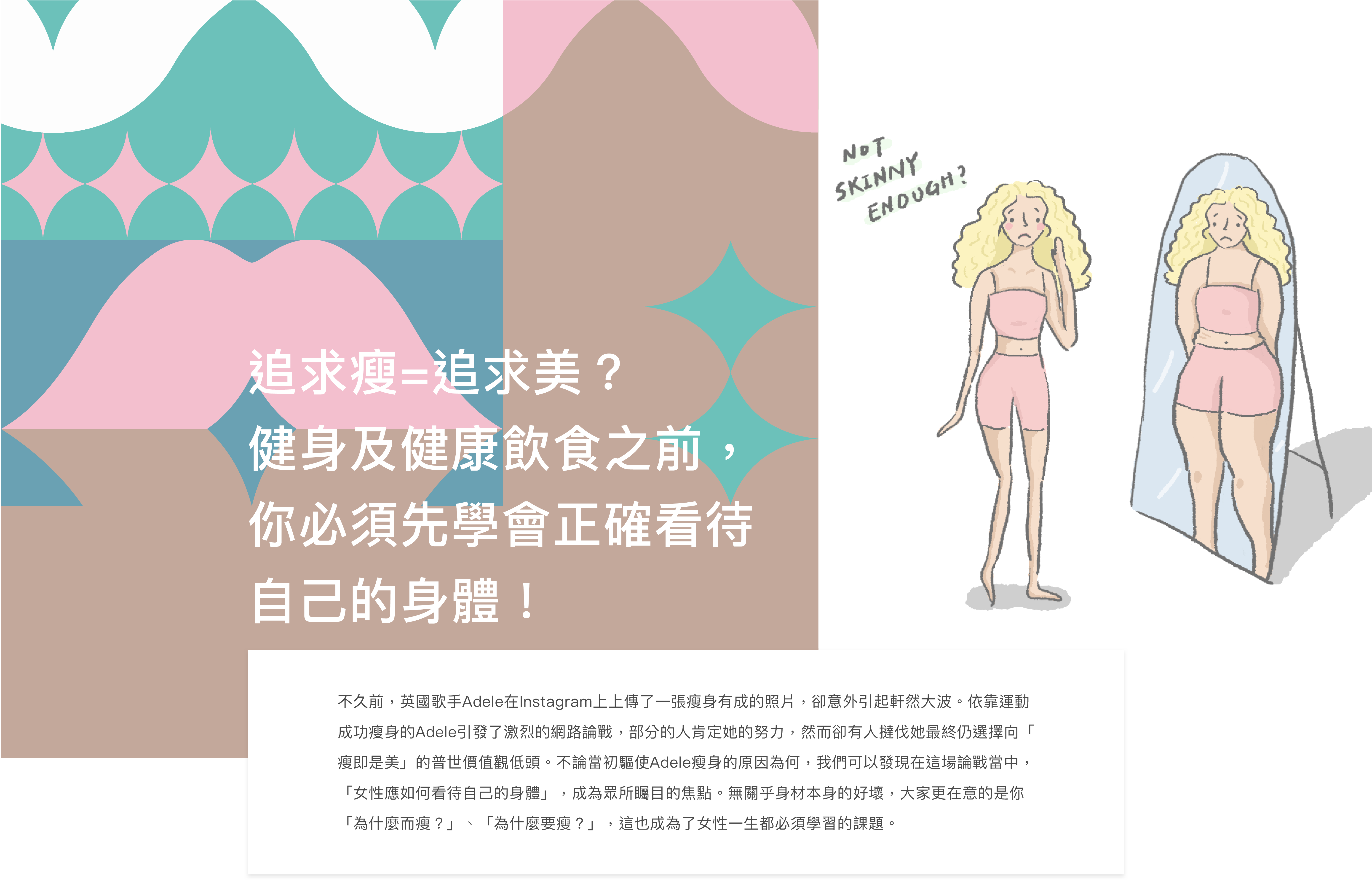 不論當初驅使Adele瘦身的原因為何,我們可以發現在這場論戰當中,「女性應如何看待自己的身體」,成為眾所矚目的焦點。無關乎身材本身的好壞,大家更在意的是你「為什麼而瘦?」、「為什麼要瘦?」,這也成為了女性一生都必須學習的課題。