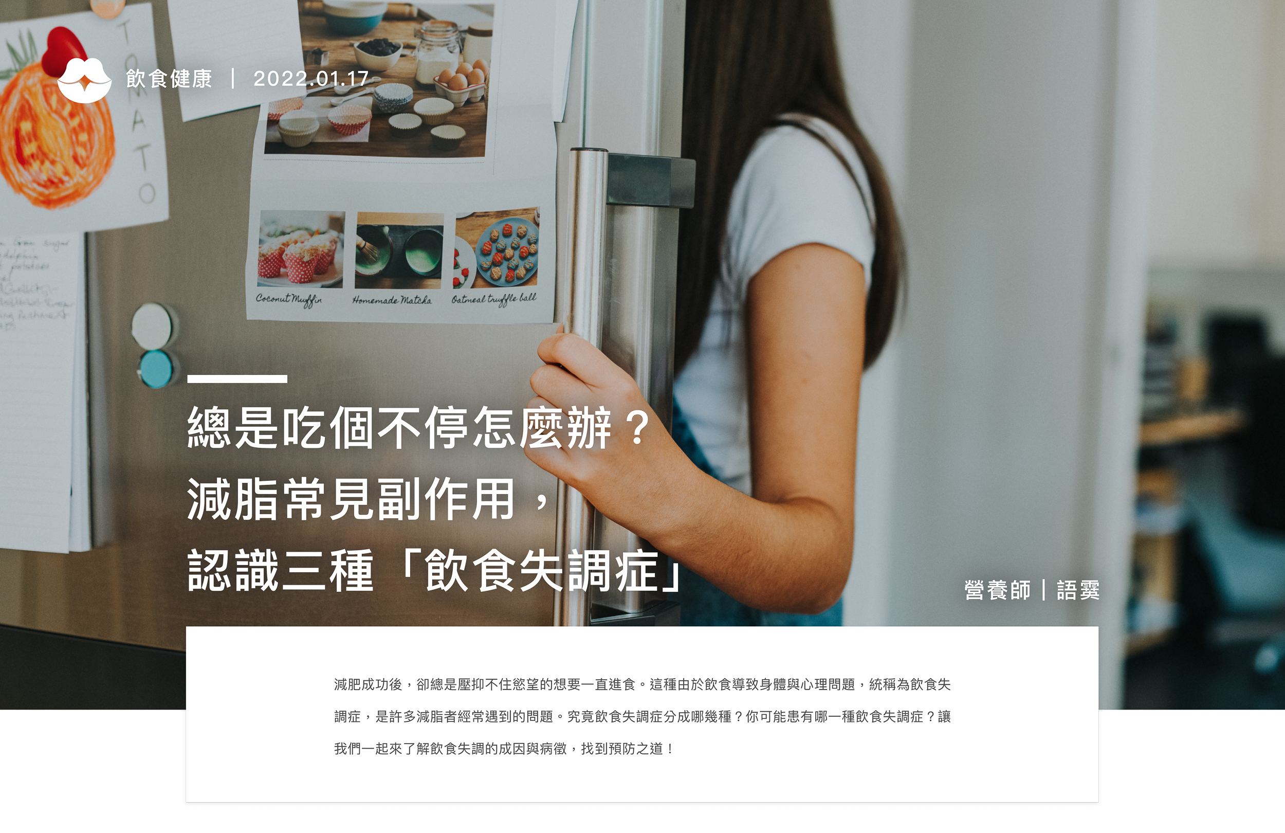 減脂看似是一場「食物」與「身體」的拉鋸戰,其實也牽涉到心理層面,當身體的需求沒有被滿足(吃不飽或營養不足),自然對於食物有強烈渴望;當我們長期用所謂健康食物填飽身體,忽視掉心理對於美食的渴望,那麼這股想吃的慾望便會火山爆發般,不定時的驅使你採取大吃一頓的行動,周而復始,無法停止。這一類由於飲食導致身體與心理問題,是許多減脂者經常遇到的問題,我們統稱為飲食失調症。