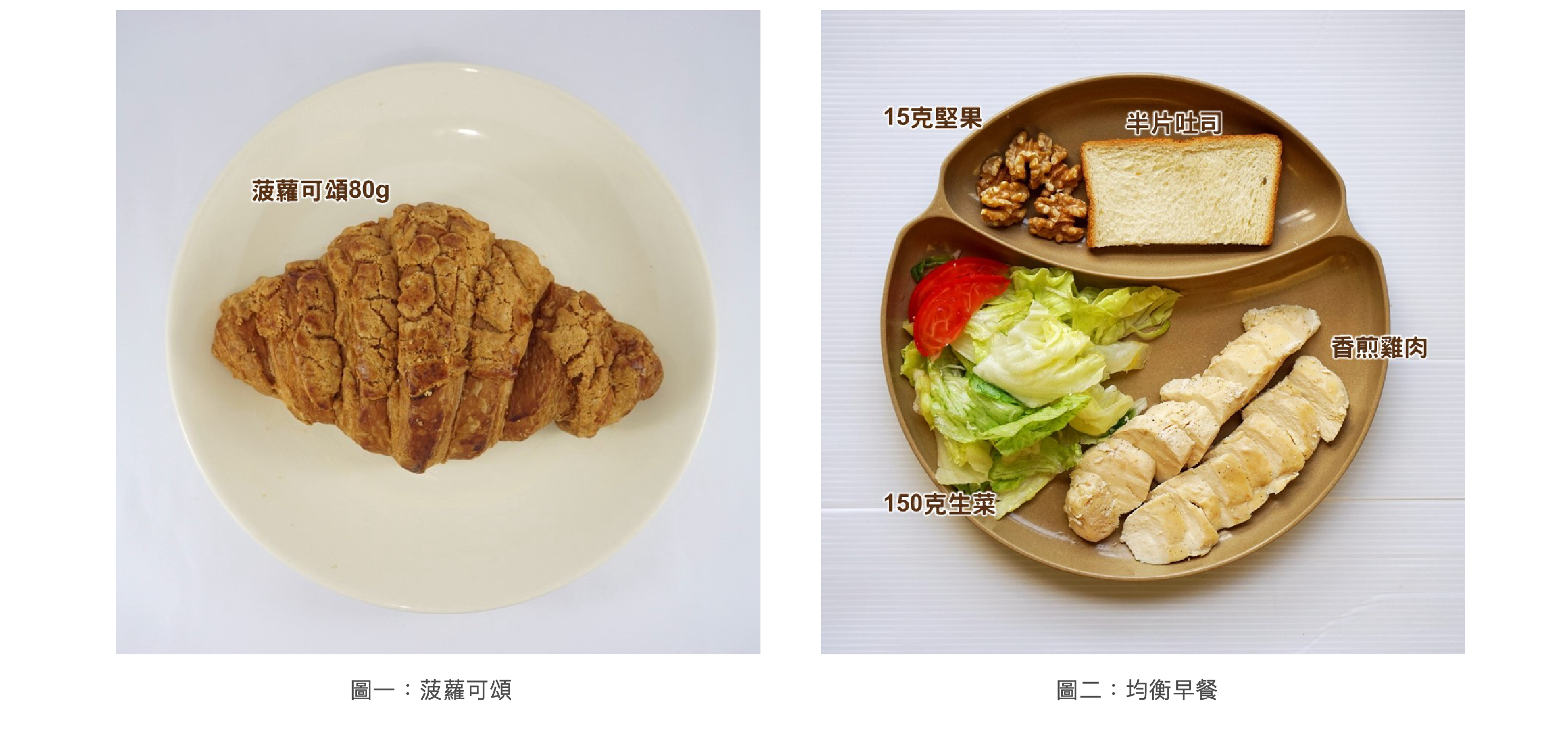 以熱量來說兩者差不多,但營養素卻大不同,菠蘿可頌的營養成分是澱粉、糖、奶油,均衡早餐是蛋白質、澱粉、堅果好油脂,以及蔬菜裡的纖維與維生素與礦物質,如果你的早餐只吃一塊麵包飽足感低也沒有足夠的營養素,但如果選擇均衡早餐,營養價值高且有飽足感,也可避免你之後亂吃其他東西,這就是選擇食材的重要性。