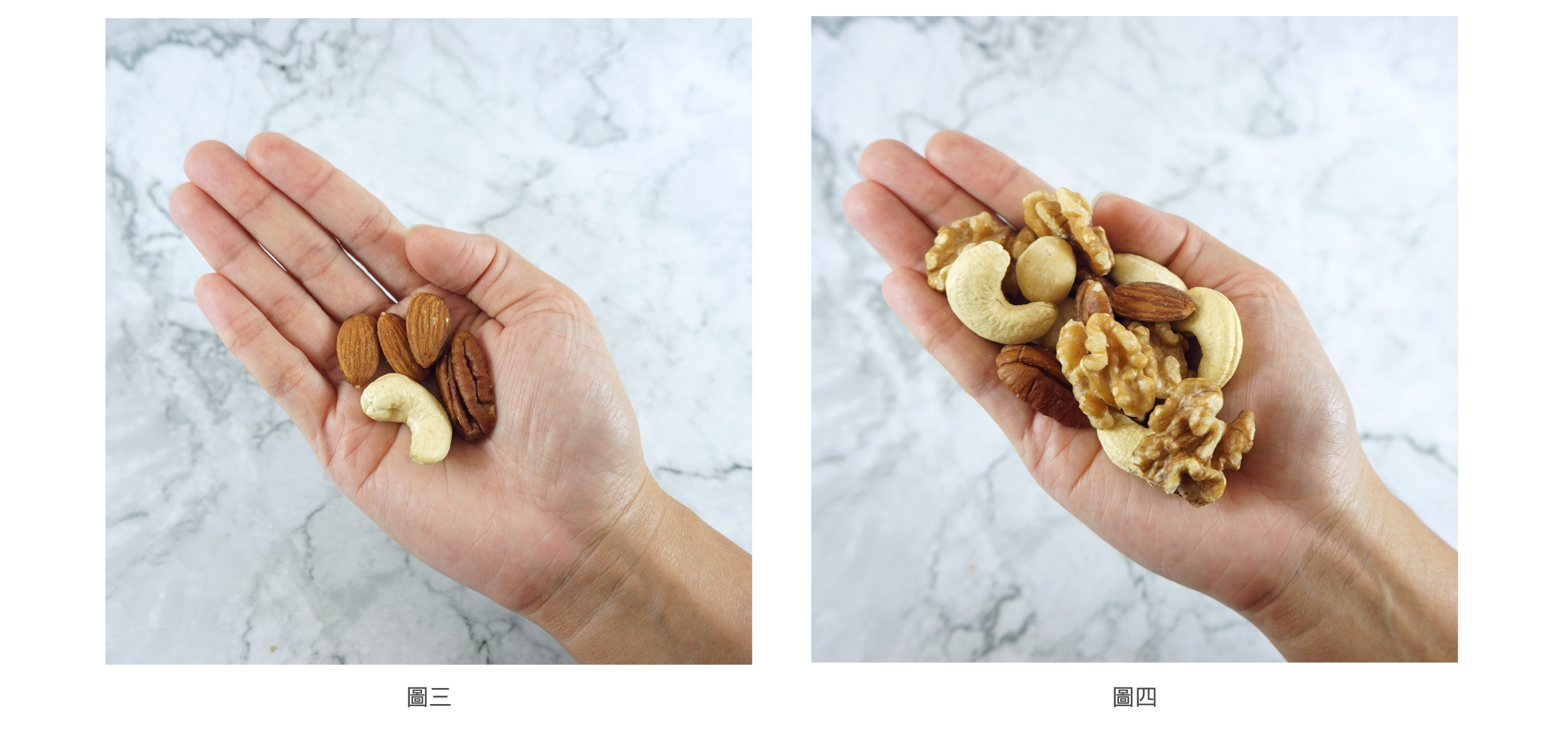 再者,當你已懂得選擇健康的原型食物,卻沒有選擇正確的份量也是瘦不下來;例如堅果是大家推崇的超級食物之一,當你只吃8克是45大卡(圖三),但吃40克就是225卡(圖四),因此就算是再健康再營養的食物,控制份量也是必要的,否則熱量過多也是會累積成體脂肪。所以擇食的主要原則是:選擇正確的原型食物,並選擇適合的份量,並非要你不吃。