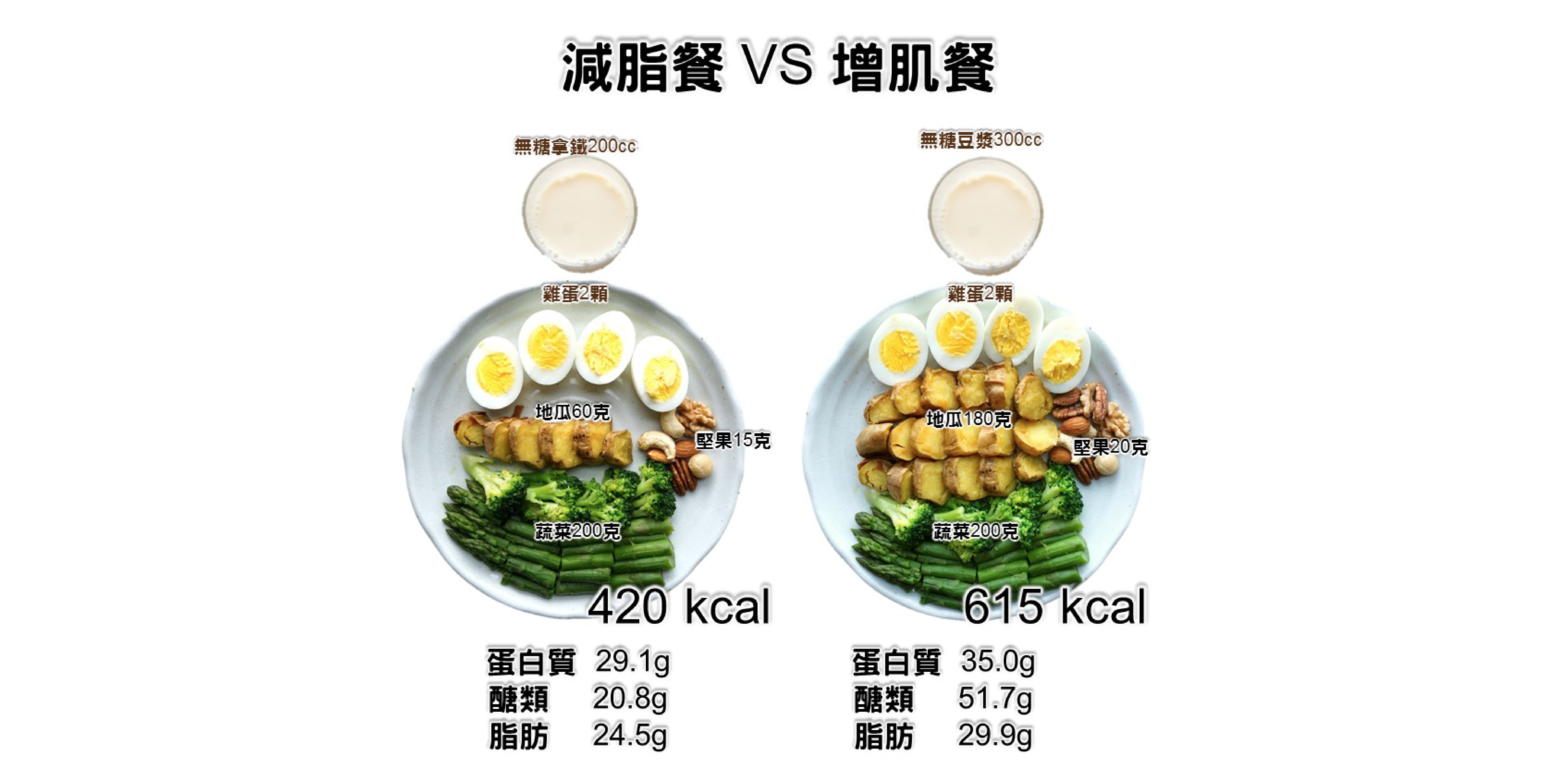 減脂時可降低醣類與油脂的量,熱量便得以下降。增肌時若熱量攝取不夠,人體易消耗肌肉來產生能量則無法有效增肌,因此需要增加醣類和蛋白質的量,一是藉此增加熱量,二是提供足夠的原料來生成肌肉。兩種飲食都是以原型食物為主,但要去調整三大營養素的比例;由下圖可看出地瓜(醣類)、豆漿(蛋白質)、堅果(脂肪)量不同,其他則無不同。