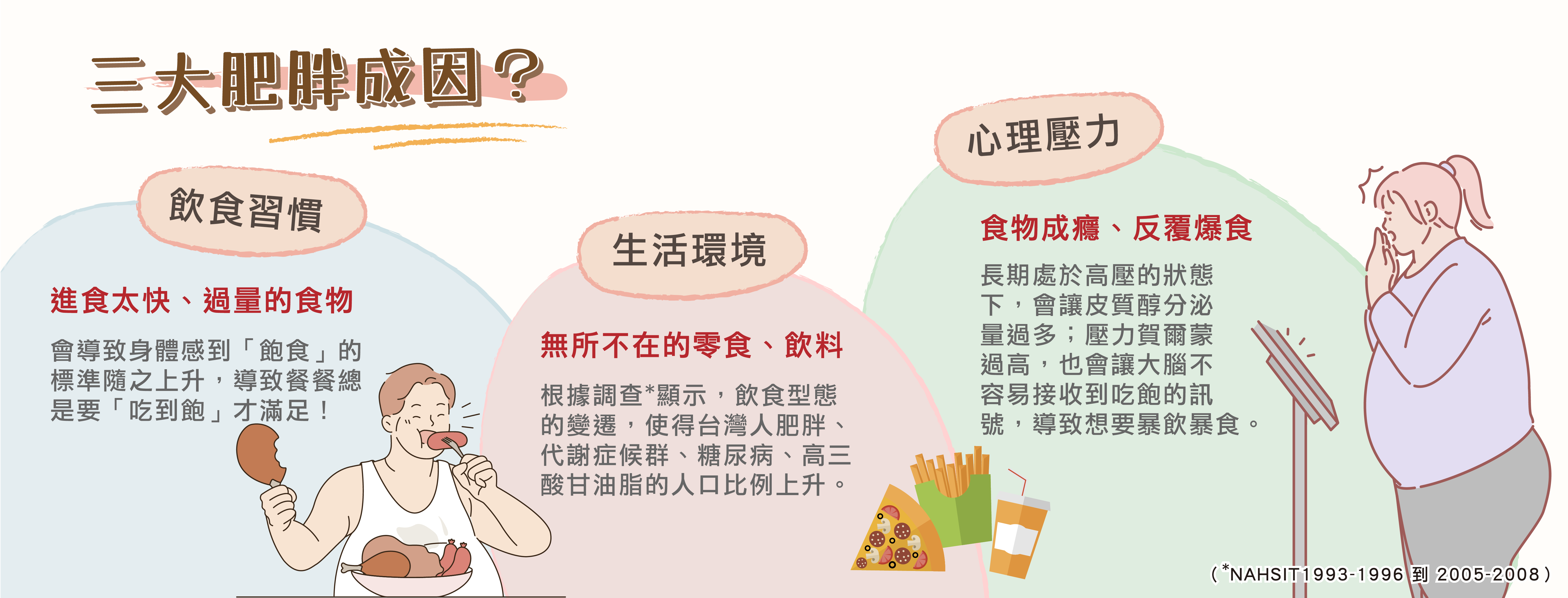 現代人生活便利,24小時都有得吃,隨手可得的零食、餅乾、便利的外送餐點、手搖飲料、速食,從早吃到晚是非常容易的事情。根據國民營養健康狀況變遷調查(NAHSIT1993-1996 到 2005-2008)顯示,飲食型態的變遷,使的台灣人攝取過多隱藏性的脂肪及醣類便利食品,導致肥胖、代謝症候群、糖尿病、高三酸甘油脂的人口比例上升。