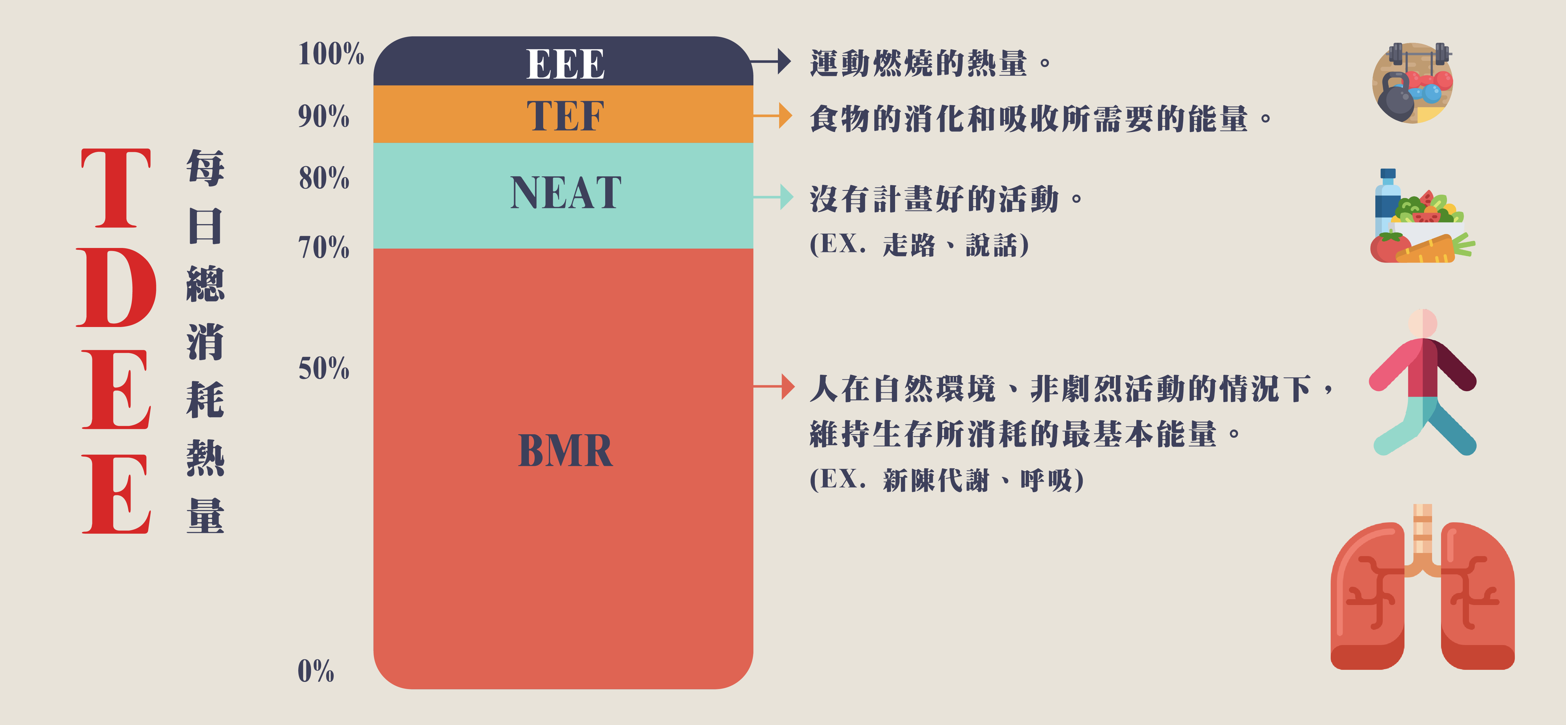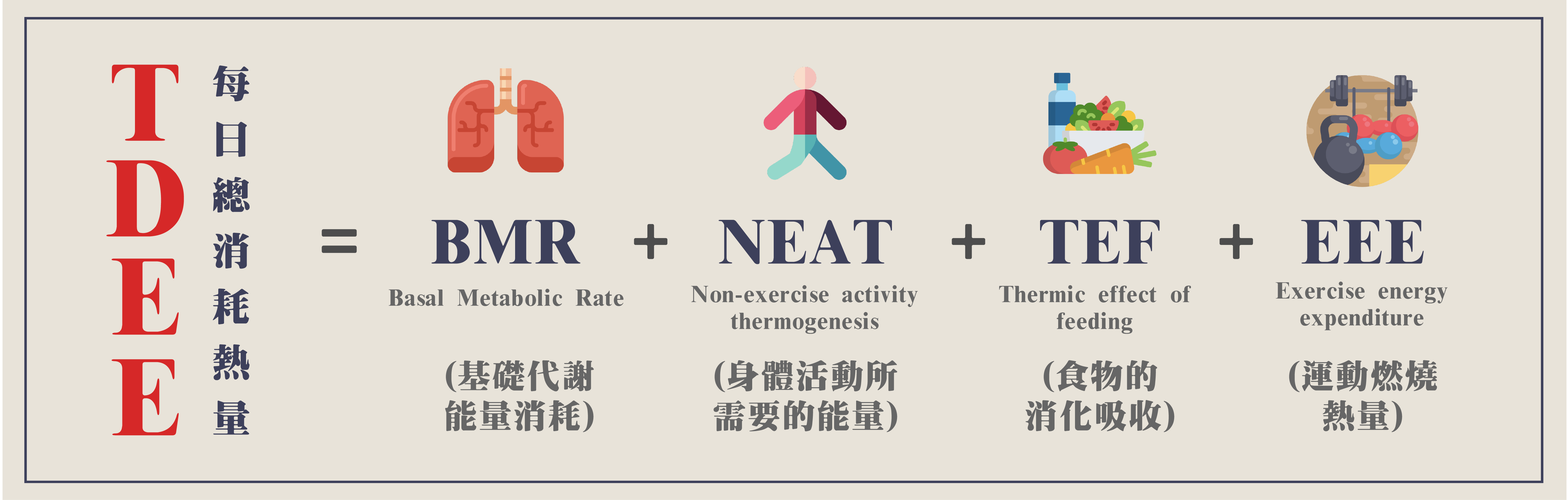TDEE = BMR(基礎代謝能量消耗) + NEAT(身體活動所需要的能量) + TEF(食物的消化吸收) + EEE(運動燃燒熱量)