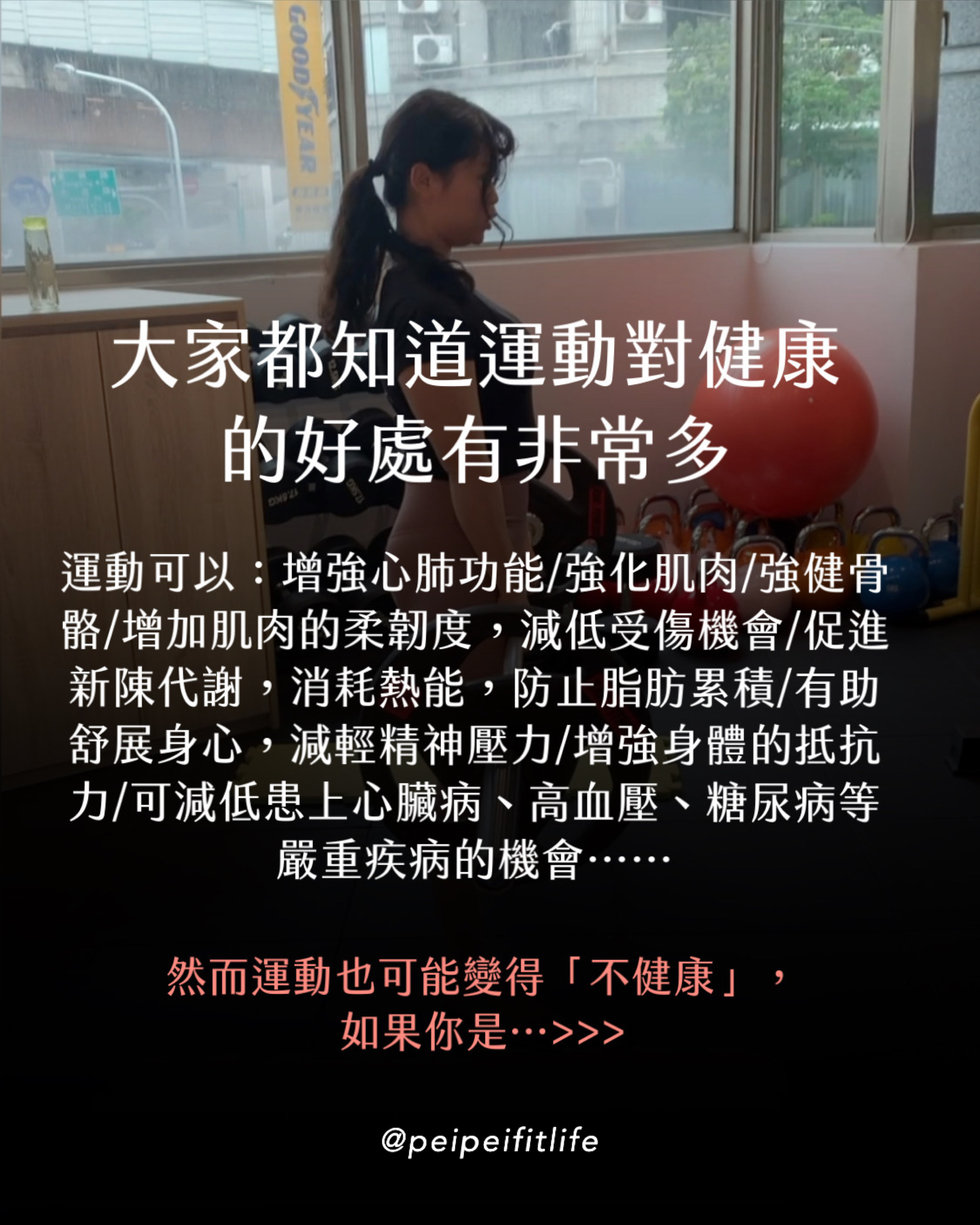 大家都知道運動對健康的好處非常多,運動可以:增強心肺功能、強化肌肉/骨骼/神經系統、增加肌肉的柔韌度、減低受傷機會、促進新陳代謝、有助於舒展身心、減輕精神壓力、增強身體的抵抗力、可減低患上心臟病、高血壓、糖尿病等疾病的機會⋯⋯。雖然運動是一件好事,然而當你的心態與出發點出現了偏差、導致身心生病或受傷時,運動就會變成一件負面且不健康的事。