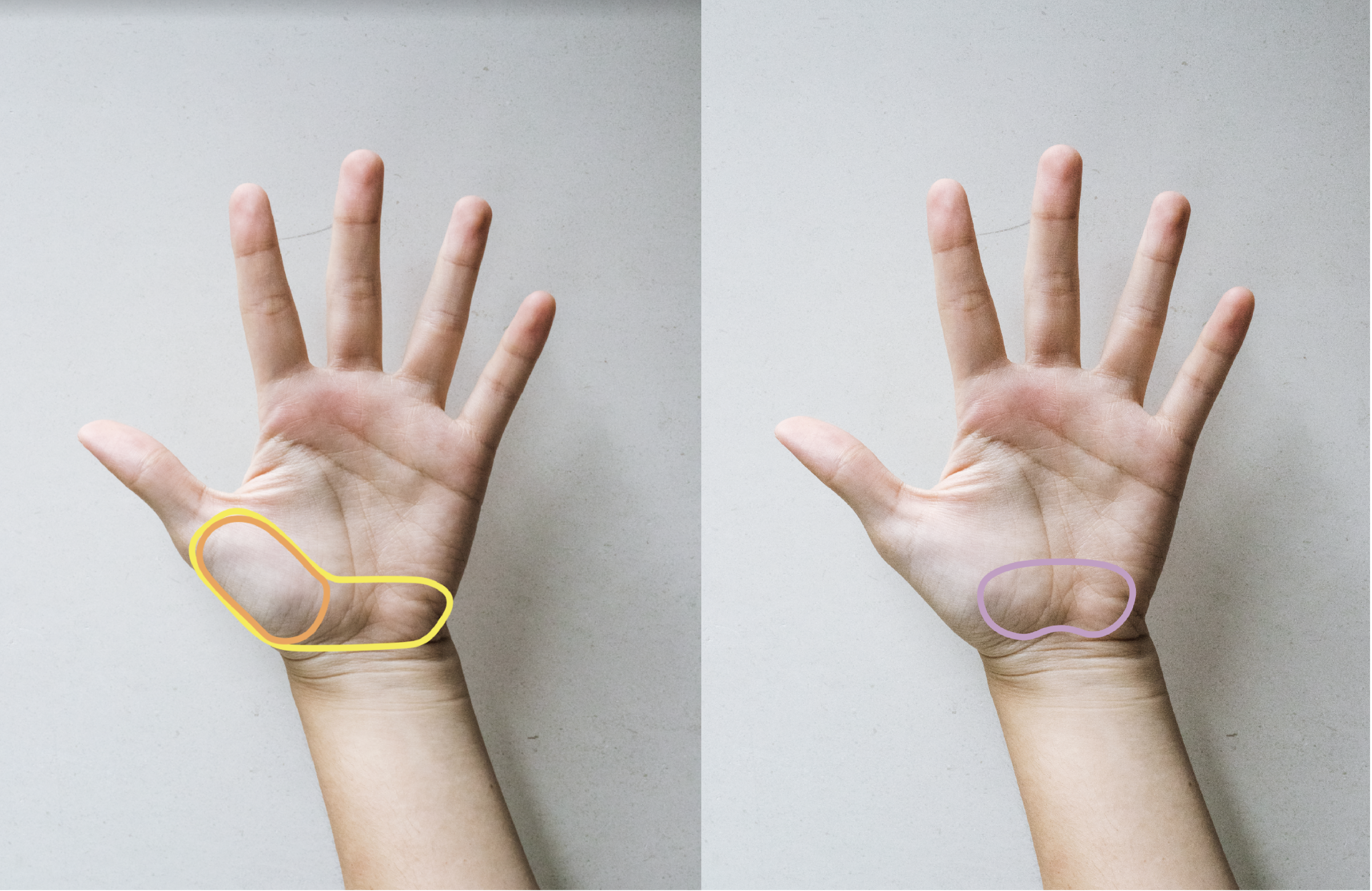 印子代表的是手掌受壓的主要部分,比較好的狀況應該是讓壓力分佈呈新月狀(黃色區域)或是在大魚際肌上(橘色區域)。如果印子都是出現在掌根(紫色區域),那就很有可能會有手腕痛的問題哦!