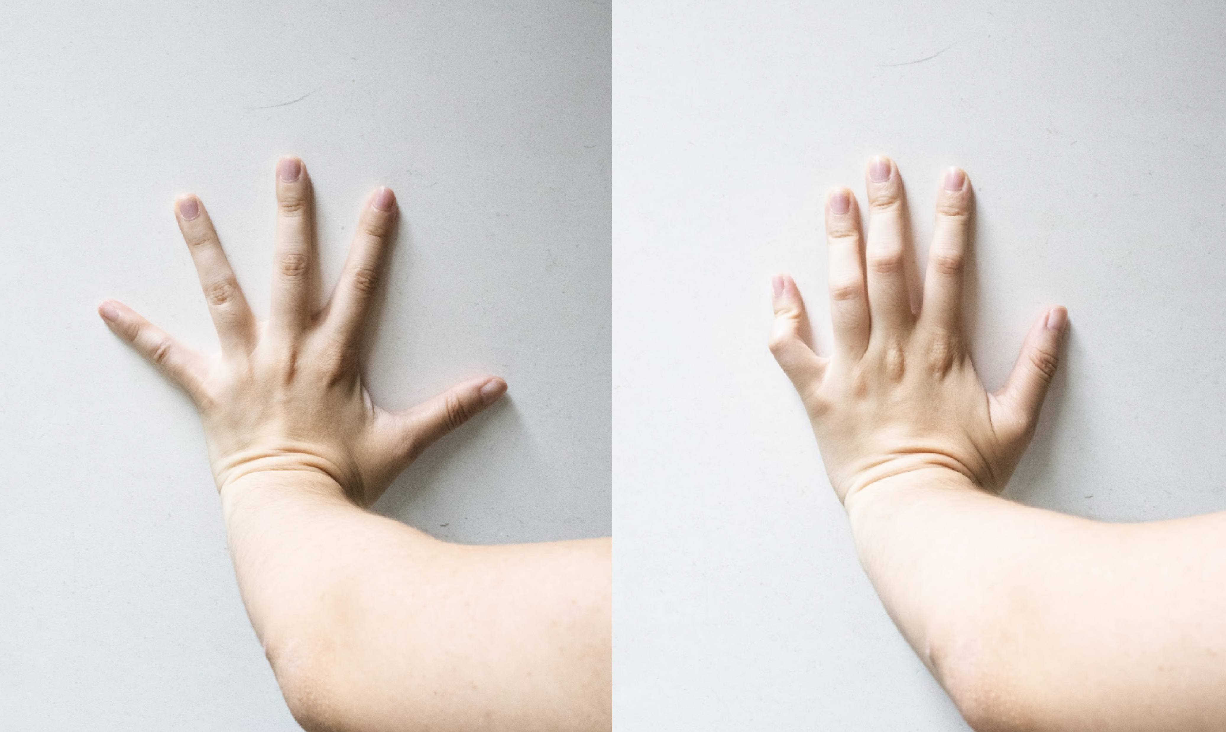手腕痛無論在瑜珈或徒手訓練都很常見,要檢驗自己的動作對不對,我們可以從兩個地方著手,分別是手腕以及肩膀。首先,先看看手掌是怎麼撐地的。做完伏地挺身、棒式又或者登山者後,把手掌拿起來看一看,你的印子分佈在手掌的哪裡呢?