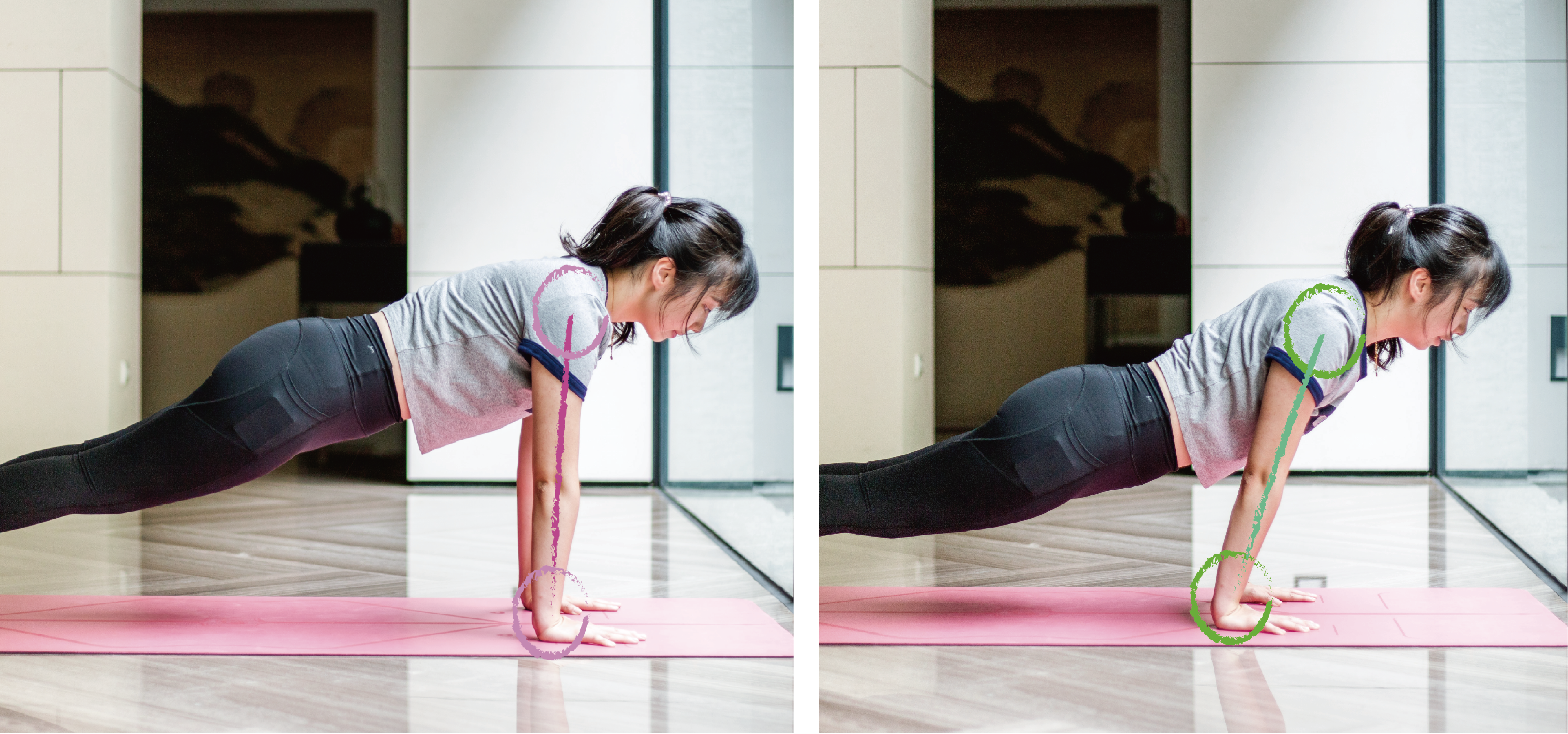 最後我們可以觀察肩膀和手腕的相對位置,撐地時肩關節應該和手腕連成一條和地面垂直的線。如果你的肩膀總是比手腕往前的話,也會帶給手腕較大的壓力,所以不妨看著鏡子調整一下肩膀相對手腕的位置!
