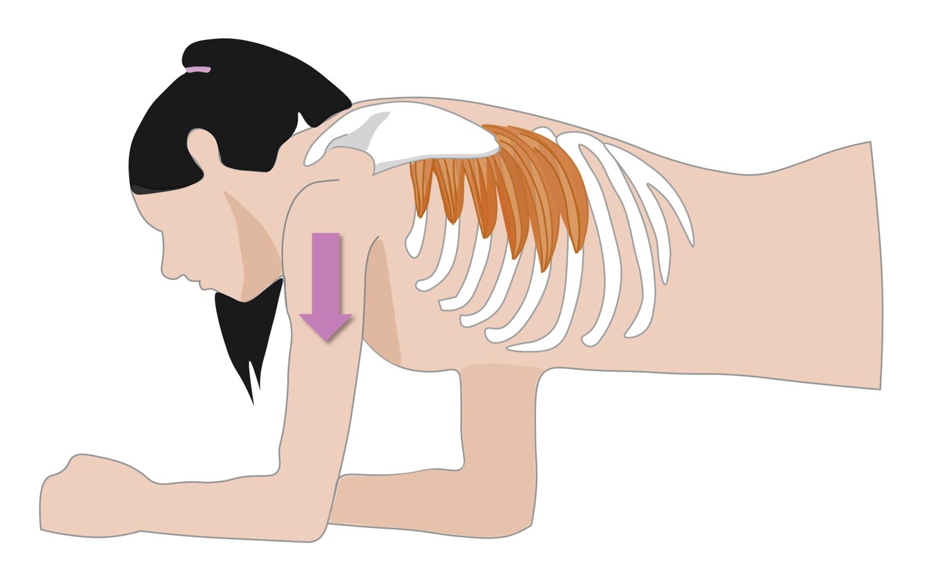 確認過手腕後,接著來看肩膀吧!手腕本身是一個相當脆弱、且不適合承重的關節,在撐地時,如果只是單純地用手部的力氣將身體撐起,長期下來會導致手腕承受巨大的壓力。因此為了減輕手腕的壓力,我們需要位於胸闊外側的前鉅肌幫忙出力,做出肩胛骨前引(Protraction)的動作。