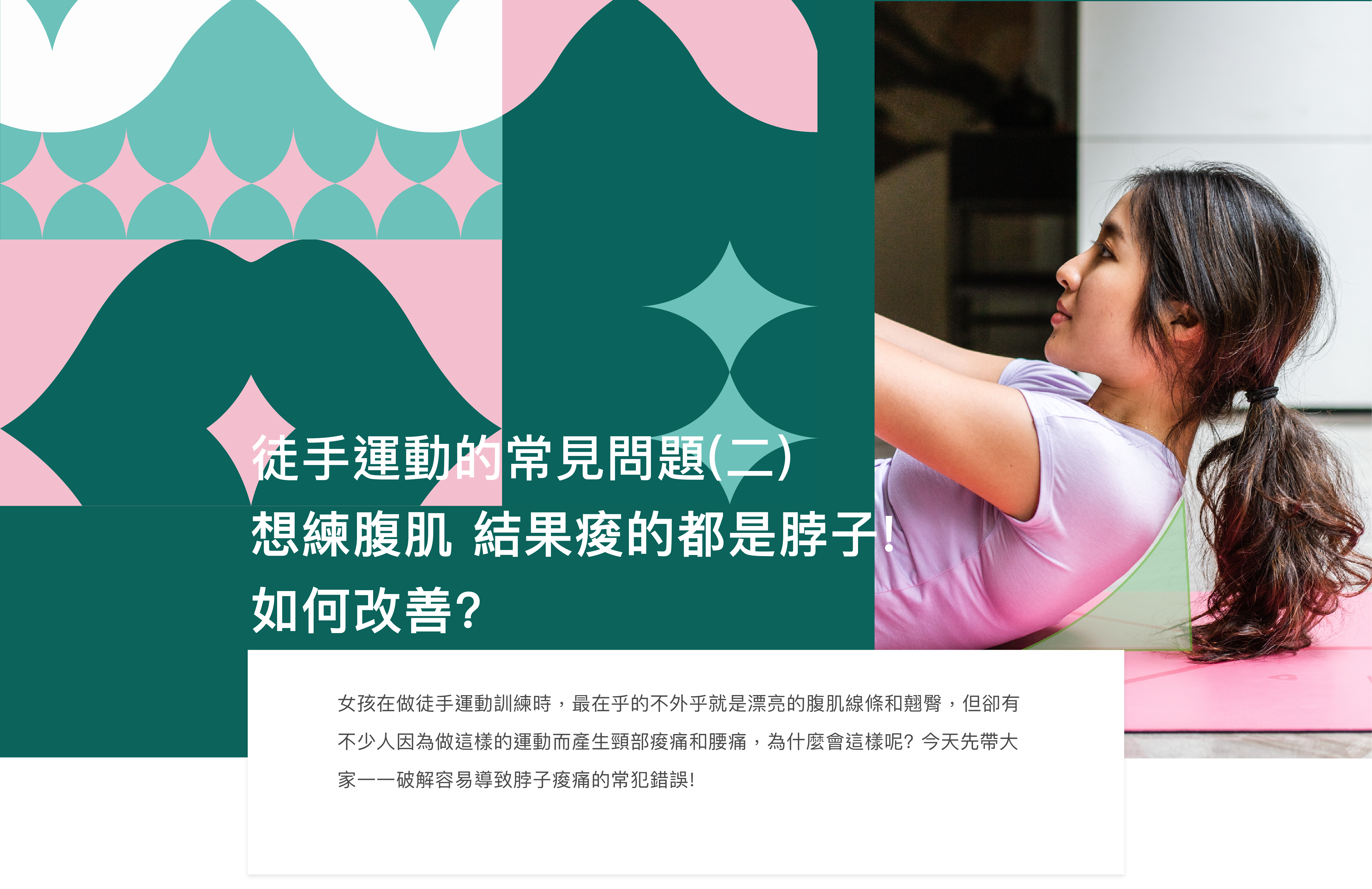 等到降階動作都可以做到由腹肌發力輕鬆完成且運動完頸部不會感到不適時,再一步步進階到常見的標準動作;若脖子依然會痠痛,用棒式系列動作或是反向捲腹來鍛鍊腹肌也是很好的選擇!至於棒式和反向捲腹需要注意的細節,就讓我們下回分曉!