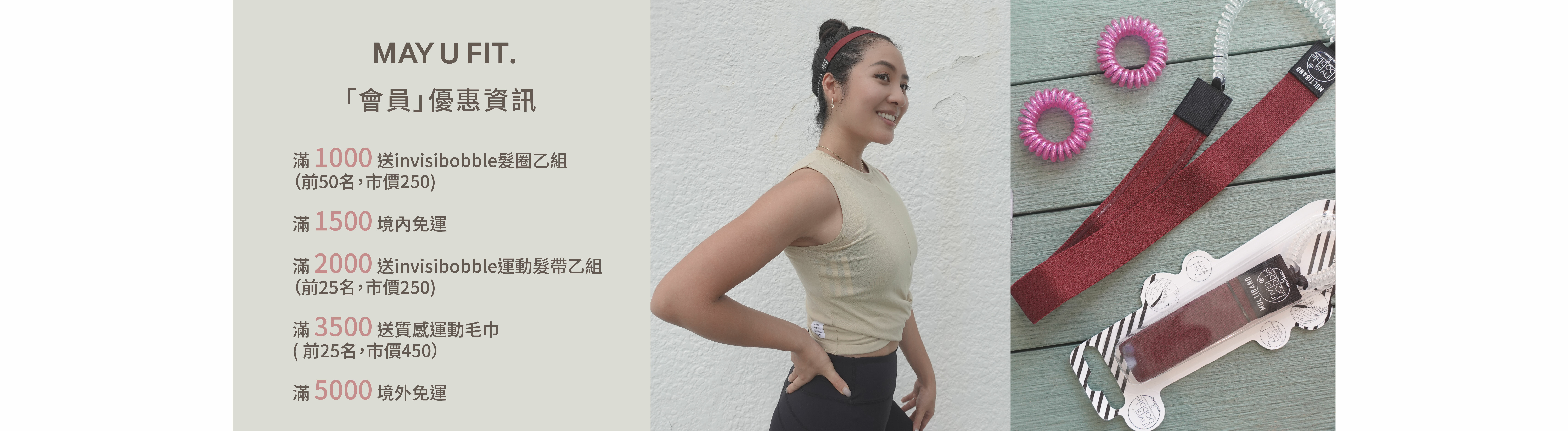 MAY U FIT 由台灣 May Fit 所創立,關注身心靈的May期許藉由品牌將「希望妳fit」的心意擴散出來,並強調「動食平衡」發展出內外兼具的生活方式。