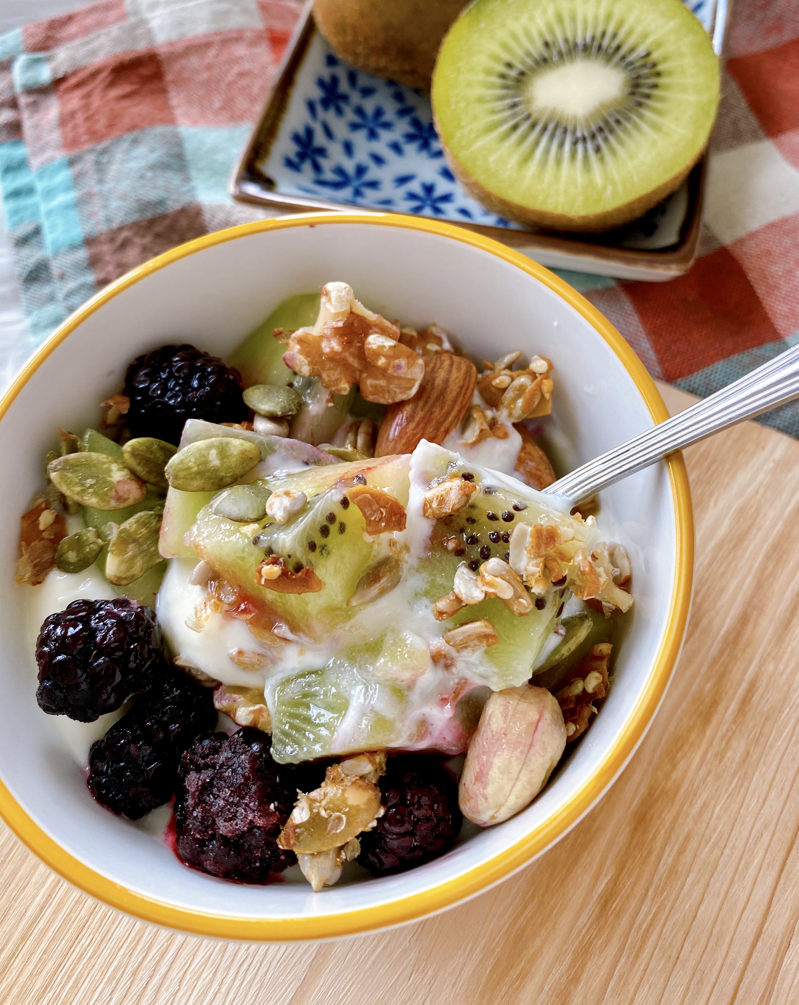 2 tbsp of Greek/sugar-free yogurt (60g), ½ a kiwi, 20g of frozen/ fresh berries, 20g of granolas, 1 large spoon of protein powder (optional, vanilla/coconut flavor)