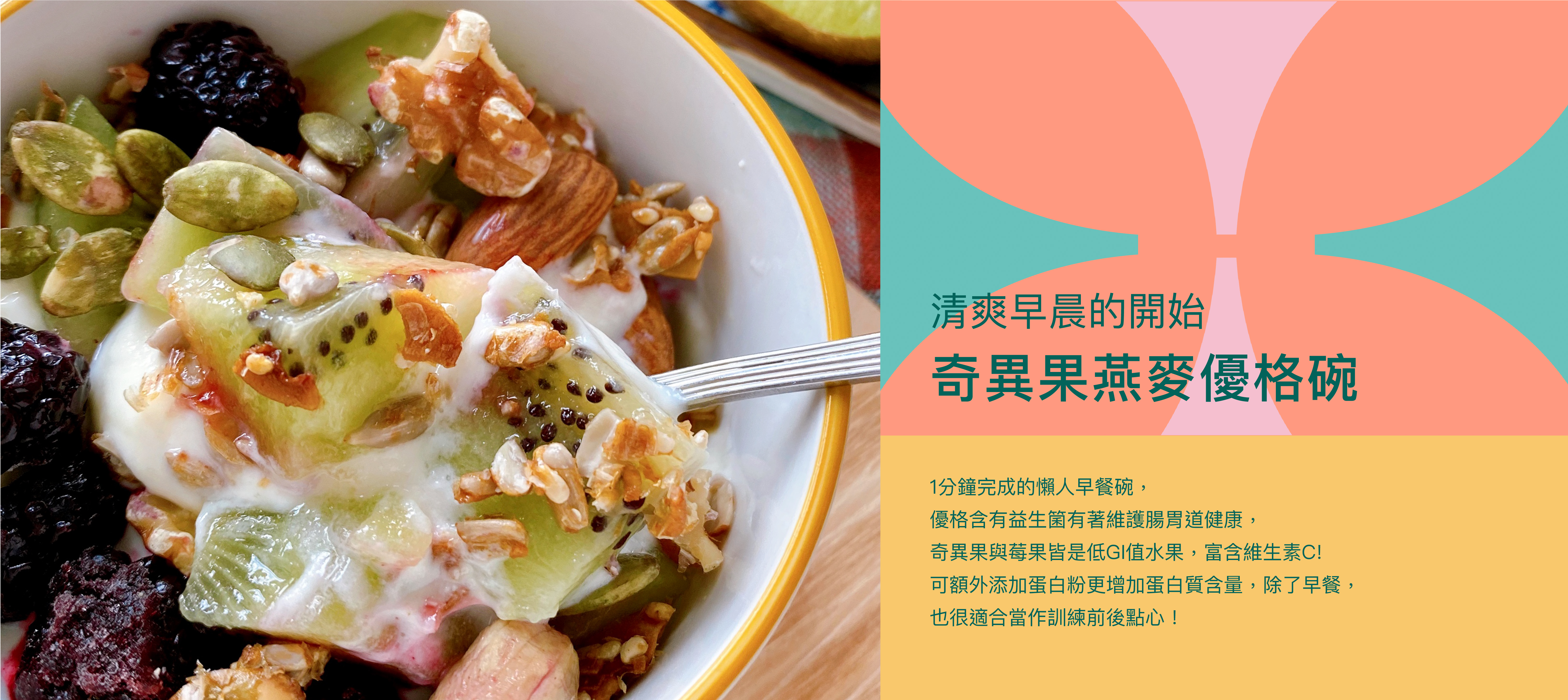 加入奇異果果肉、冷凍/新鮮莓果,灑點穀物燕麥或堅果碎,完成。