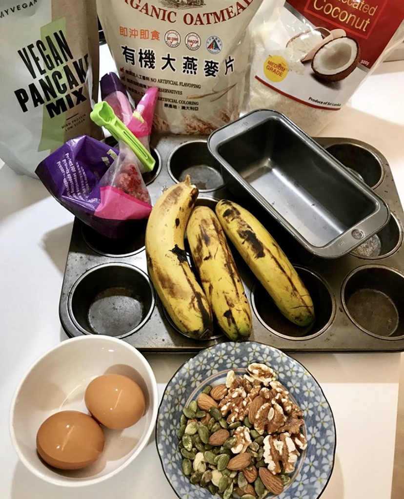 香蕉2條半用叉子壓成泥(若想保留香蕉口感,不用壓太泥)剩下的半條切薄片。打一顆蛋,加一大匙高蛋白粉(30g)一大匙燕麥片(約20g-30g) 如果沒有高蛋白粉,可用燕麥粉代替(將燕麥用果汁機打碎) 加入奇亞籽、核桃碎均勻混合。