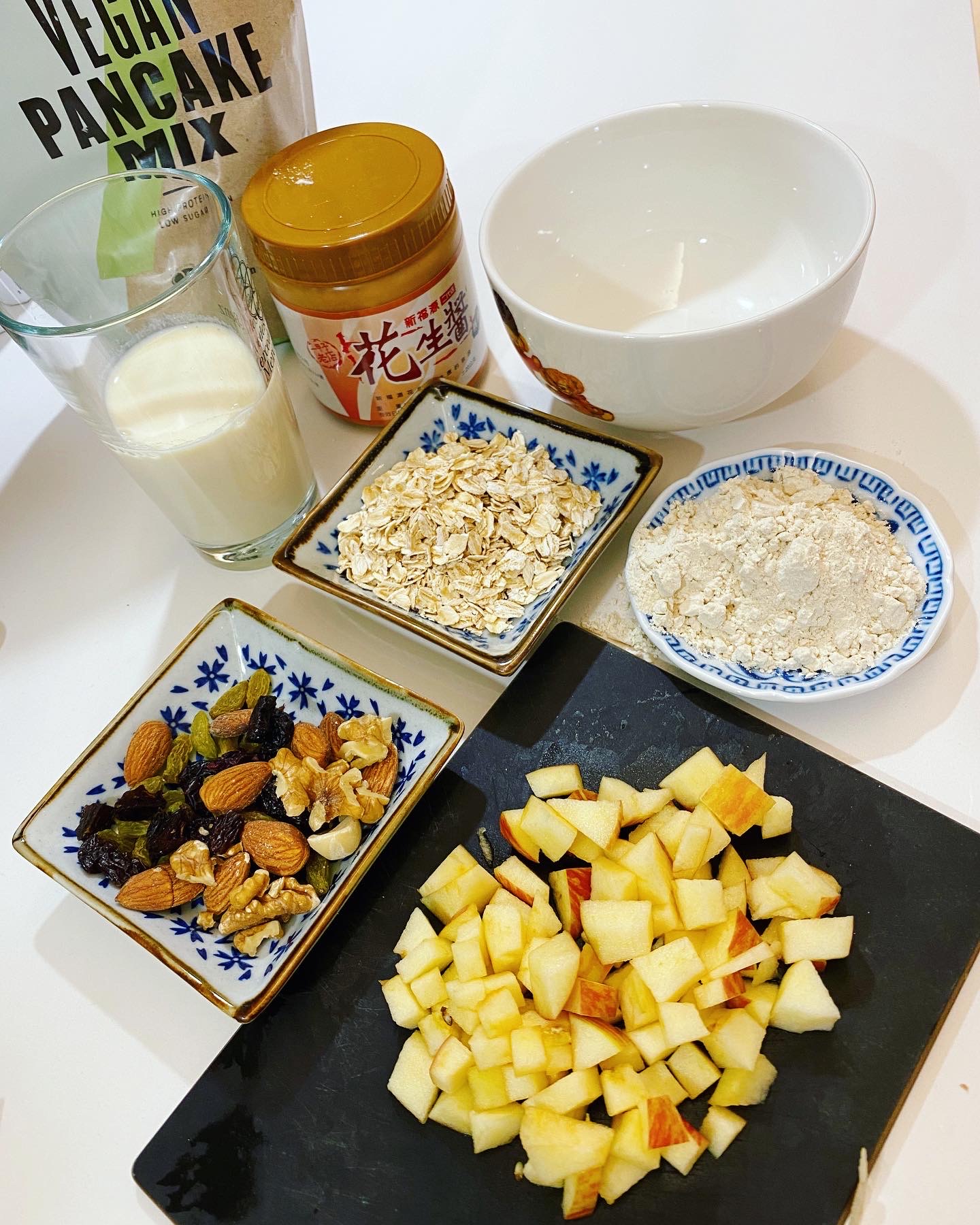 Ingredients: 1 apple (medium size), protein powder 25g, rolled oats 25g, two scoops of peanut butter(20g), sugar-free soy milk 80cc, appropriate amount of dried fruits and mixed nuts.