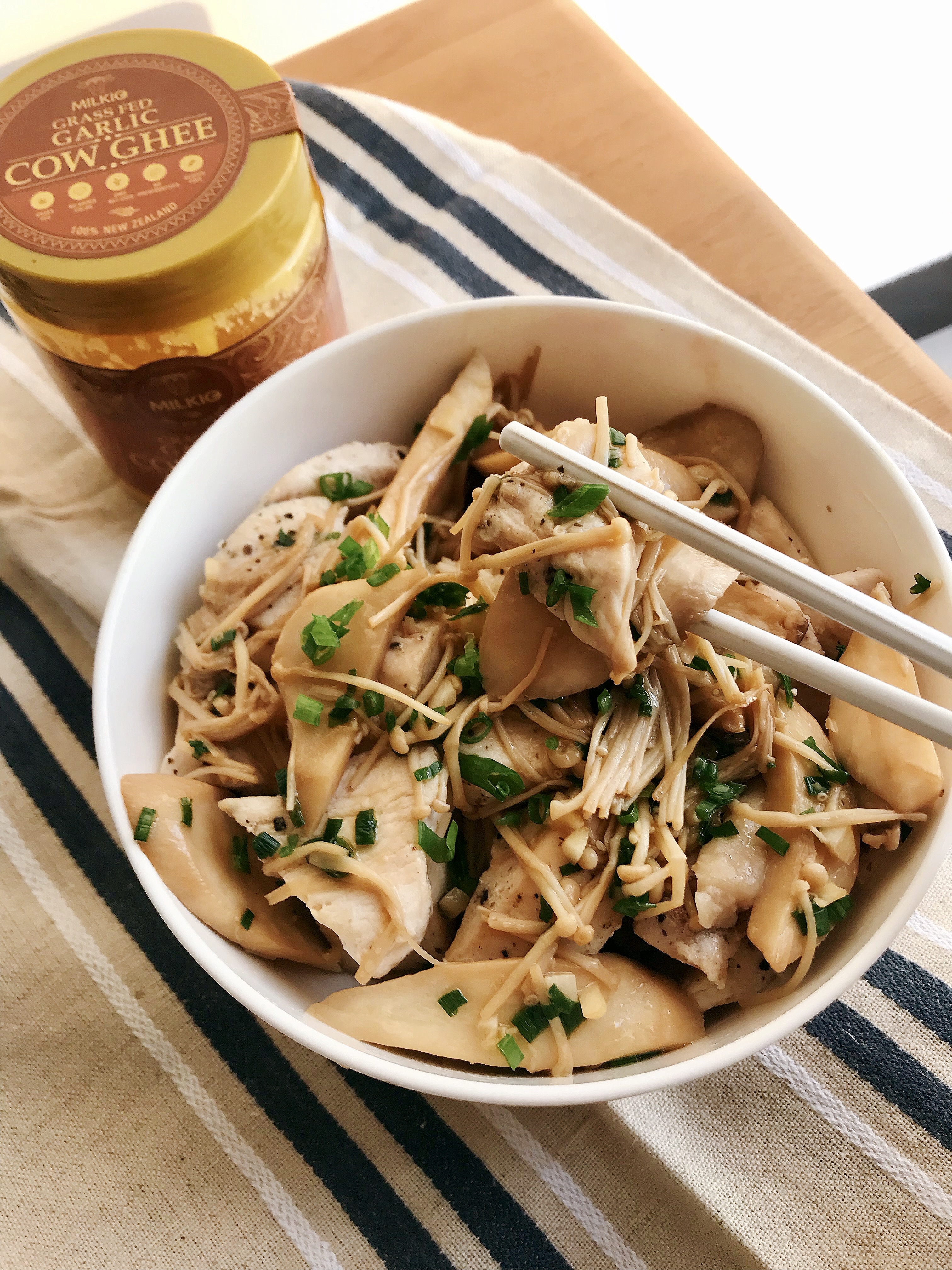 Ingredients: chicken breast 150g, 1-2 pieces of oyster mushroom, one bulb of garlic, 1 green onion. ½ pack of enoki mushrooms, butter 5-10g. 1 tbsp of soy sauce. ½ bowl of cooked rice.