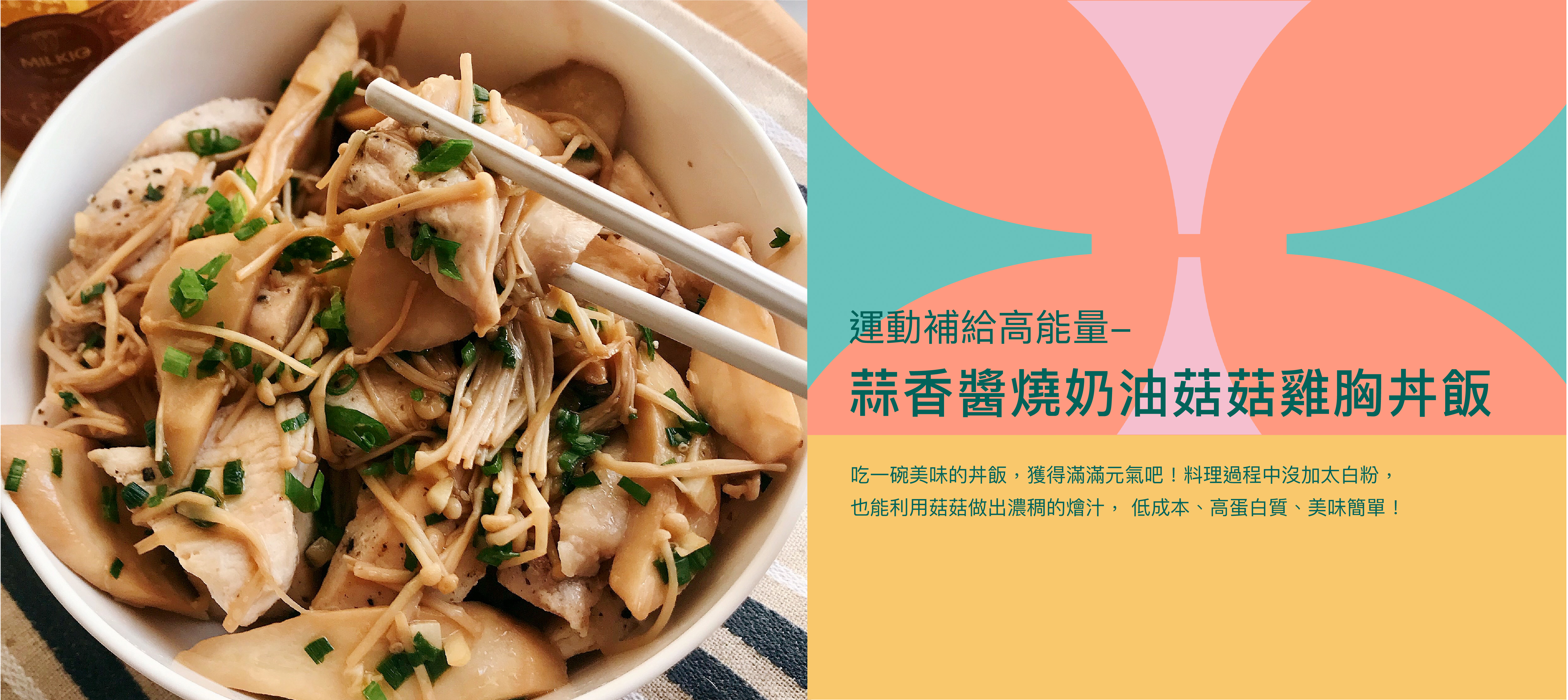 食材準備:雞胸切小塊以鹽、黑胡椒、橄欖油/酪梨油醃製20分鐘以上。杏鮑菇1-2條切片、金針菇去梗對切。蒜頭切末,蔥切末備用。