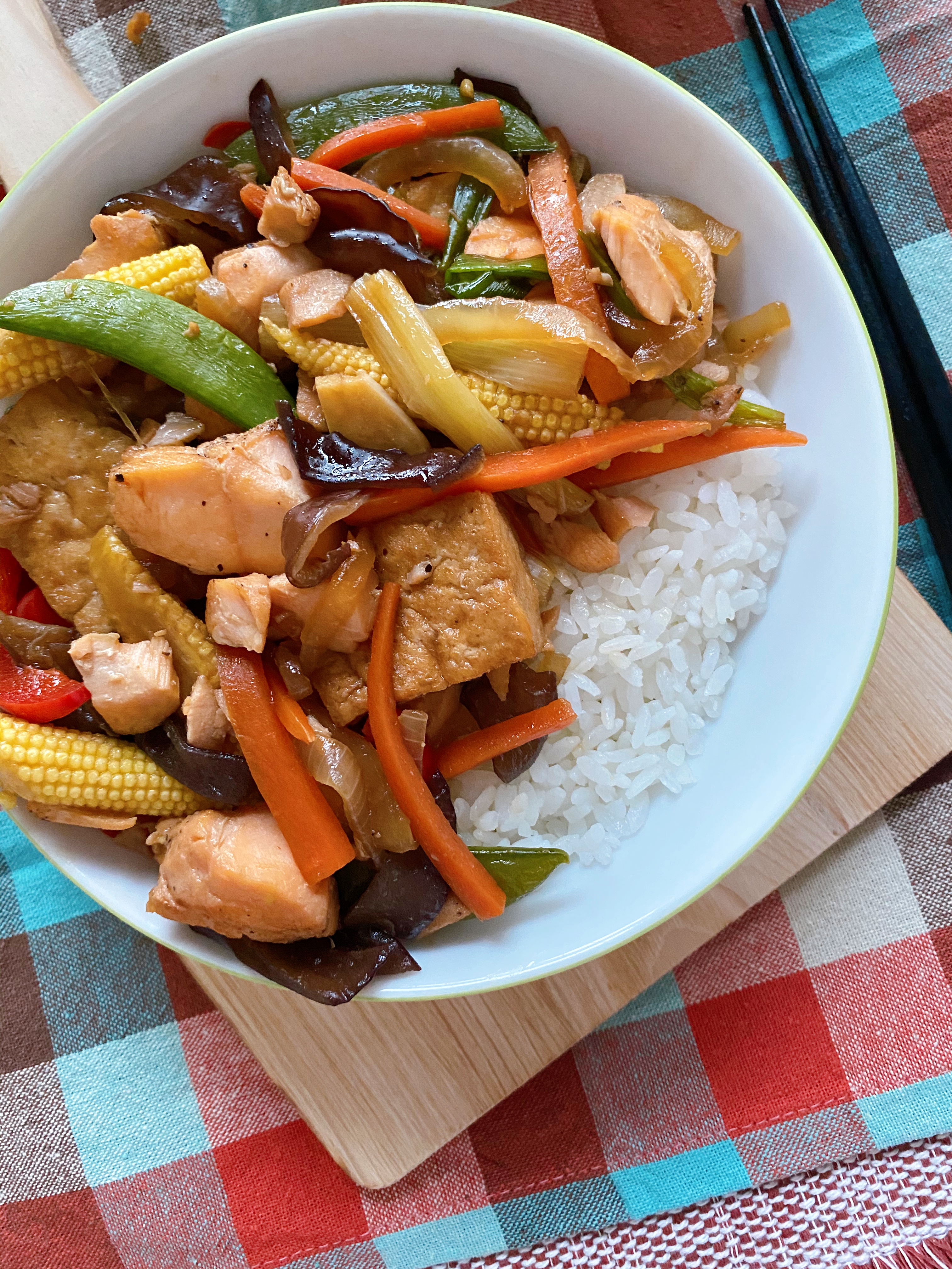 Ingredients: Salmon fillet 120g, ½ box of firm tofu, ¼ of onion (sliced), green onion, 4-5 baby corns, ¼ of red bell peppers (sliced), 1 cup of grated carrot. 1 cup of black fungus, green peas, 1-2 cloves of garlic, ½ bowl of cooked rice.