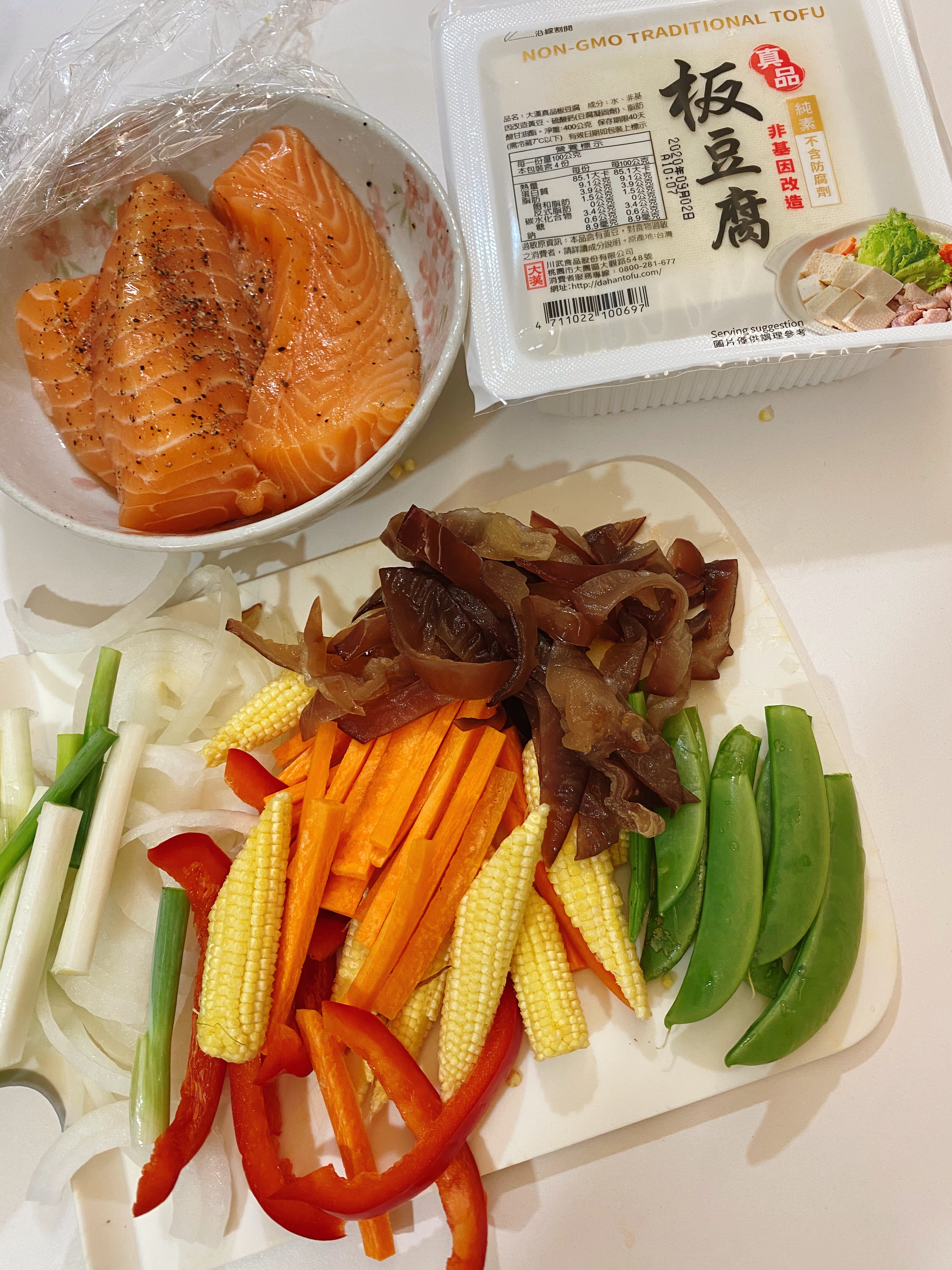 鮭魚用鹽、胡椒醃製20分鐘以上。板豆腐用廚房紙包覆並以重物壓住10-15分鐘以瀝乾水分。鮭魚與豆腐皆切成易入口大小,洋蔥切絲,蔥切段、蒜頭切碎、玉米筍對切、彩椒切絲、木耳去蒂頭切絲。平底鍋熱一匙油,煎鮭魚&板豆腐至兩面金黃盛起備用。