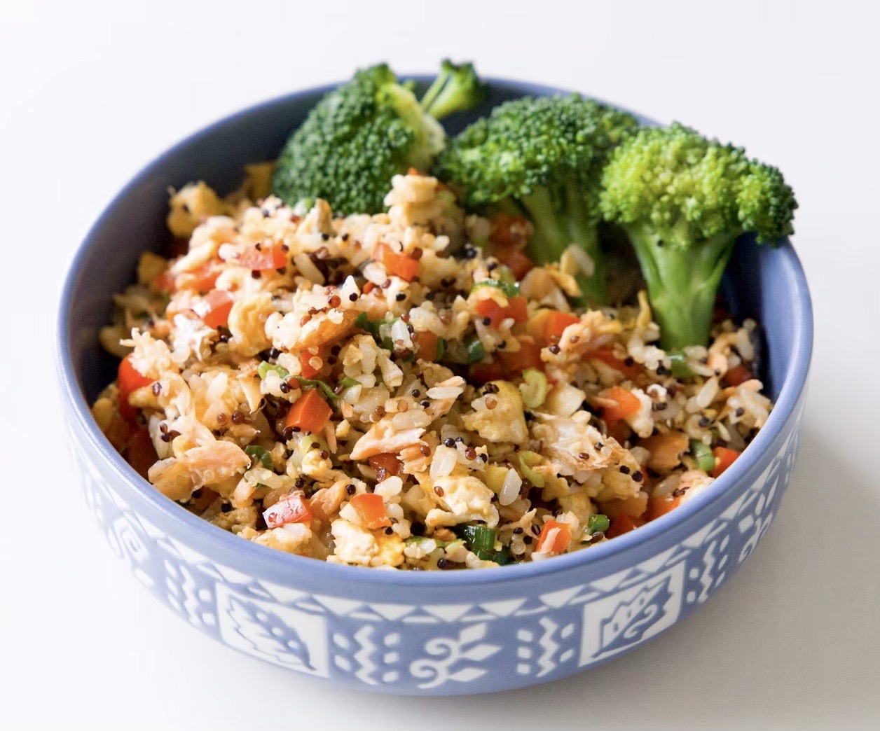 Add a little oil onto a frying pan over medium heat. Pour the egg mixture onto the frying pan and scramble it. Then, add in the quinoa rice and garlic and stir-fry together until fragrance. Next, add in the minced red bell pepper and salmon, and continue to stir-fry. Lastly, add 1 tbsp of soy sauce and green onions, and stir well to finish up. A fragrant healthy meal is ready to serve!