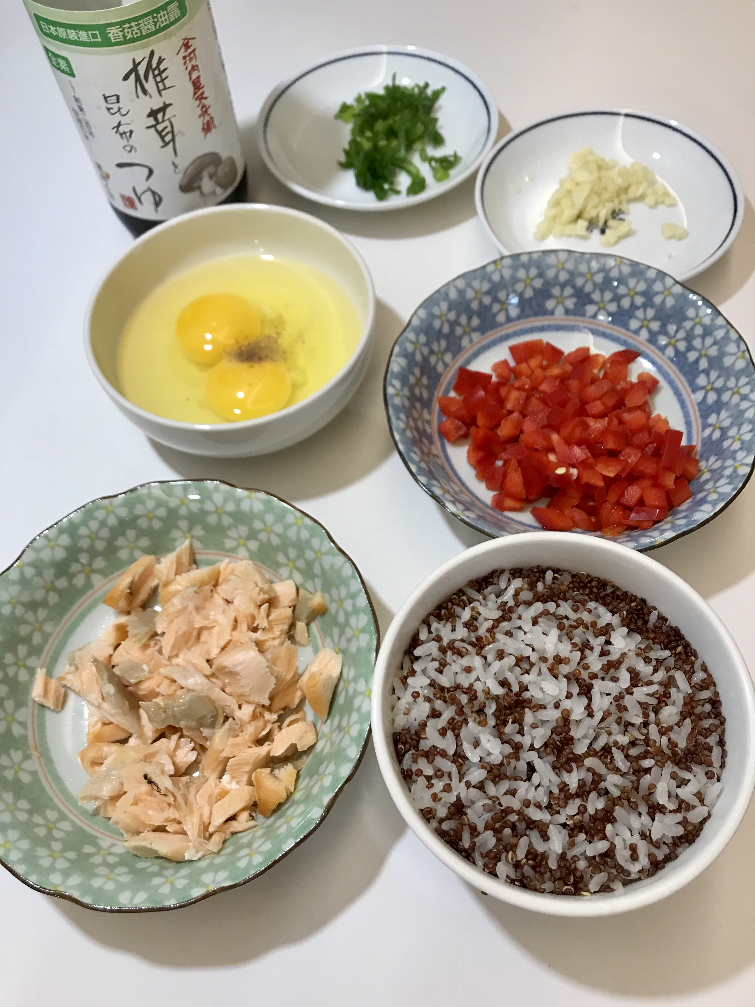 Ingredients: Salmon fillet 160g, two eggs, ¼ of red bell peppers. 1-2 clove of garlic, ½ cup of red quinoa, ½ cup of white rice. 1 green onion. Seasoning: salt, pepper and 1tbsp of soy sauce.