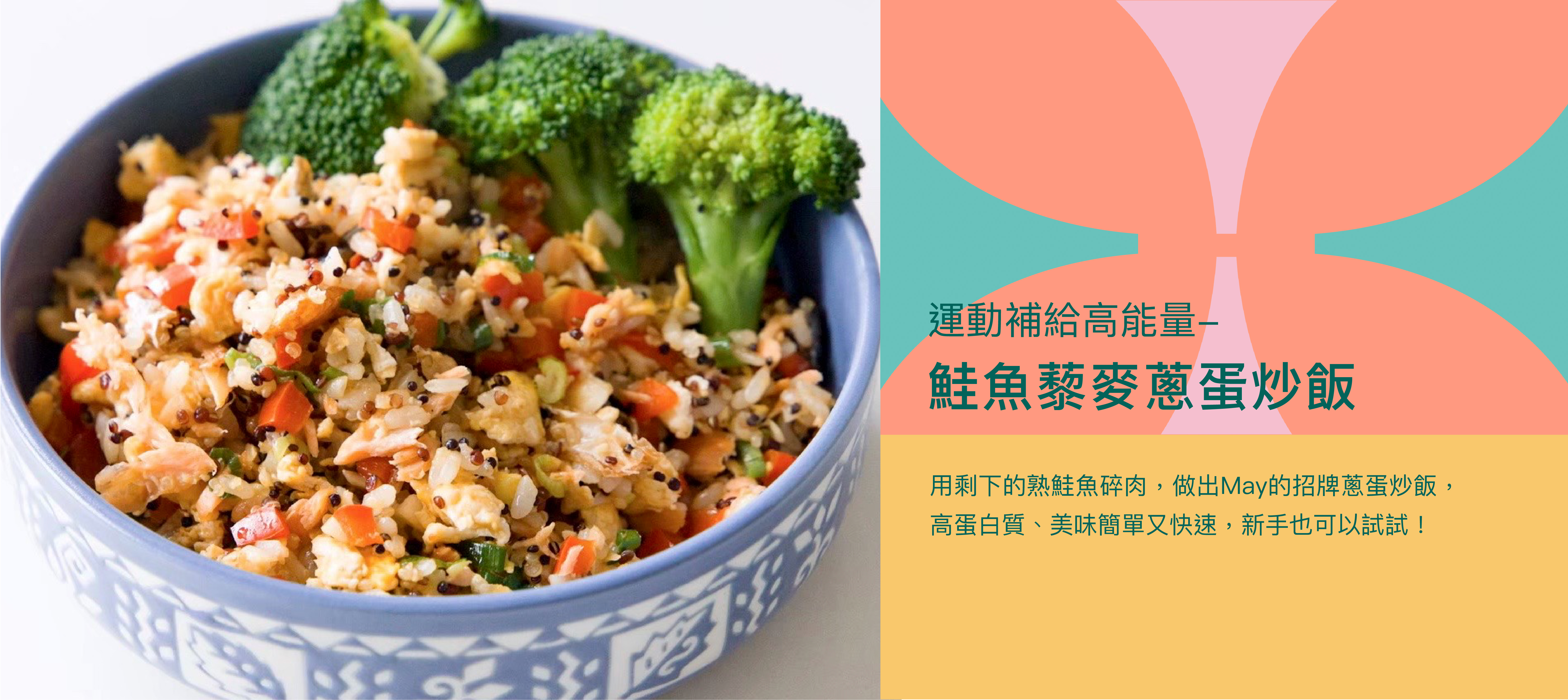 平底鍋開中火倒少許油,蛋液倒入用木鏟炒得碎碎的後,下藜麥飯+蒜末一起拌炒至香,下彩椒和鮭魚碎一同拌炒,最後加一匙醬油炒至變色,下蔥花快炒一下上桌,香氣四溢!