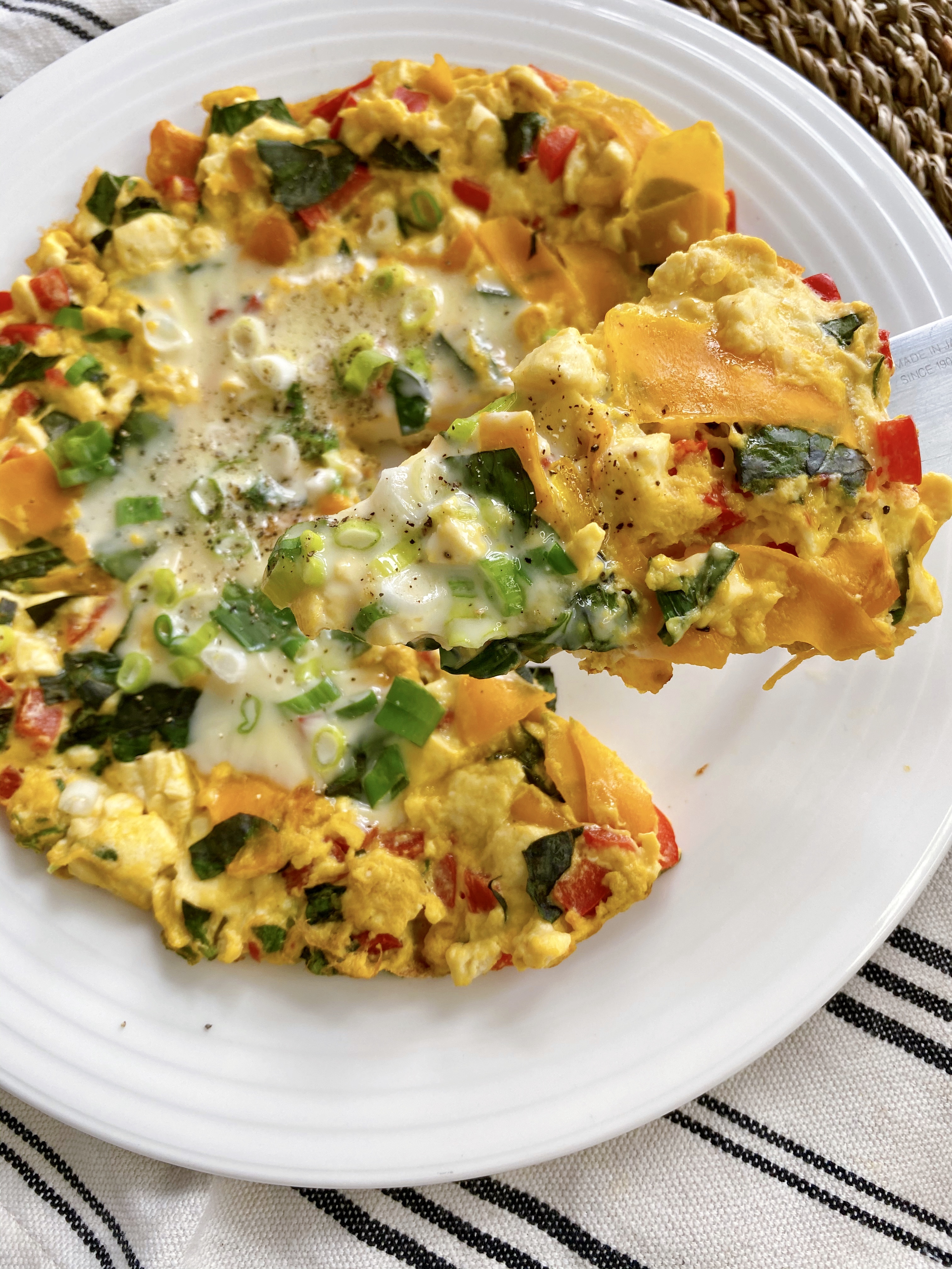 Ingredients: two eggs, ½ a box of tofu, grated pumpkin (25-30g), ¼ of a red bell peppers (diced), 1 slice of low-fat cheese, a handful of basil leaves, a pinch of salt and pepper.