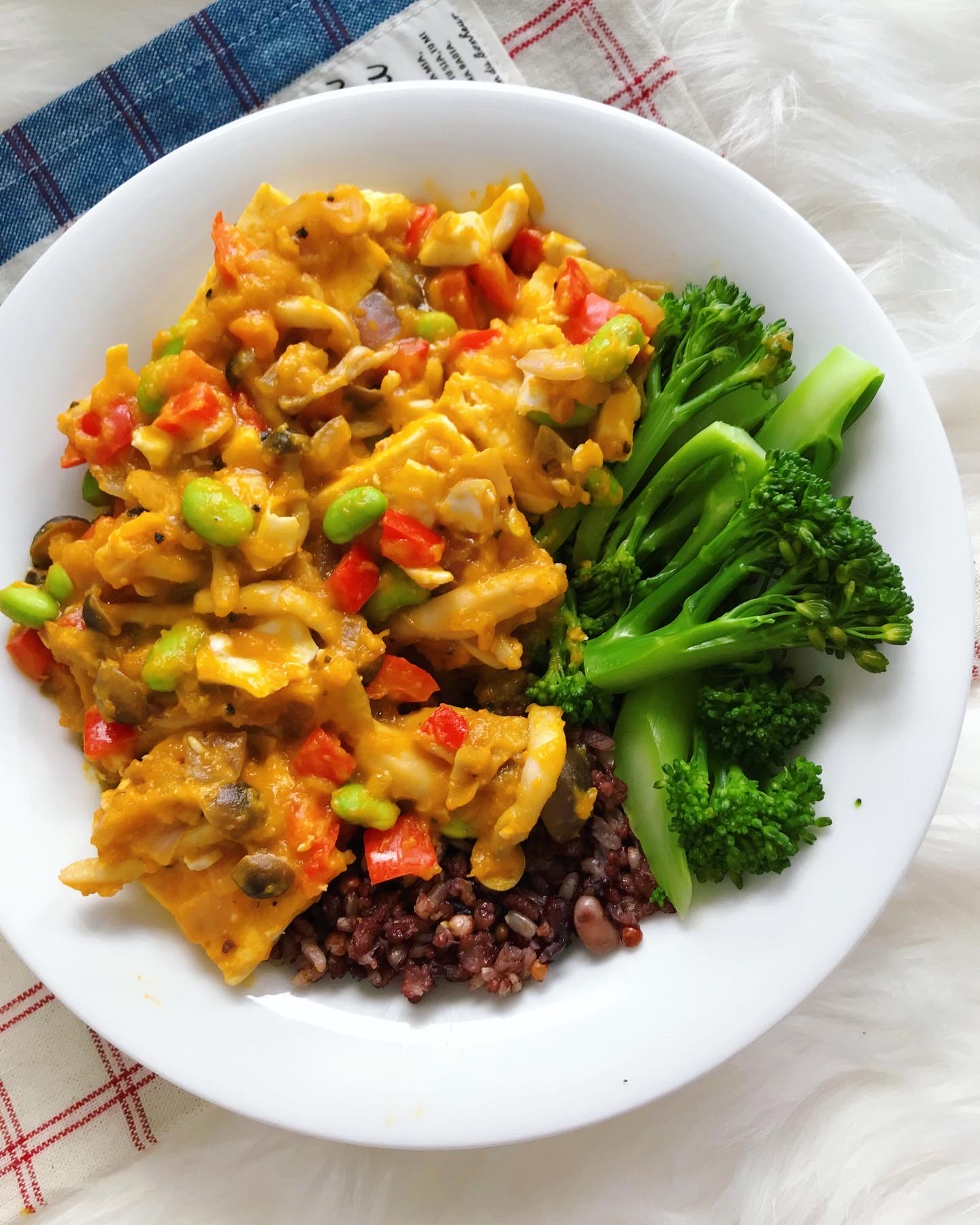 Ingredients: pumpkin 100-120g, ½ a cup of edamame, ½ a box of firm tofu, ¼ of an onion, 1 clove of garlic, ½ a bell pepper, 1 cup of shimeji mushrooms, 1 salted egg, ½ a bowl of broccoli, 100-150cc of sugar-free soy milk, ½ a bowl of 5-grains rice, appropriate amount of salt and black pepper.