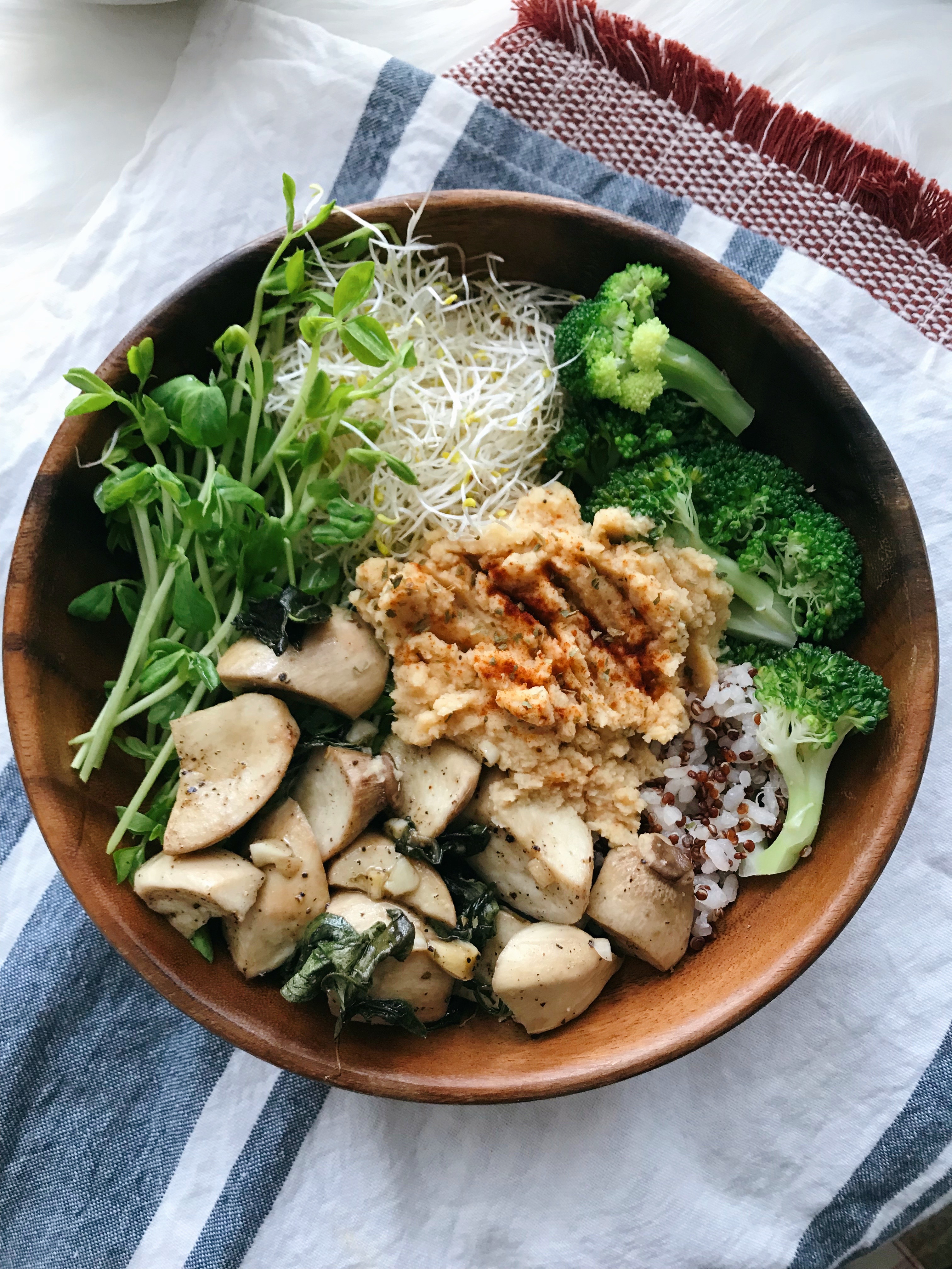 Quinoa bowl with hummus and air-fried basil mushrooms