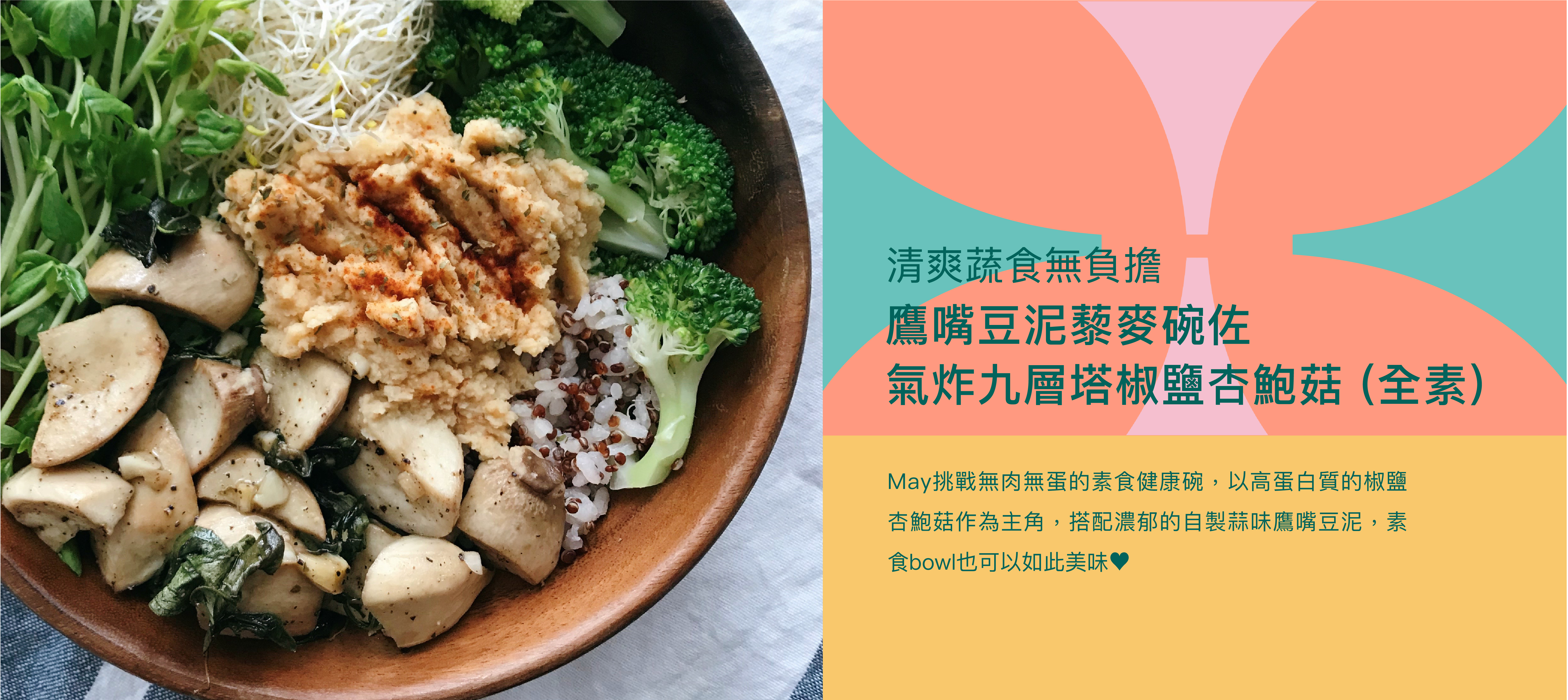 鷹嘴豆泥藜麥碗佐氣炸九層塔椒鹽杏鮑菇(全素)