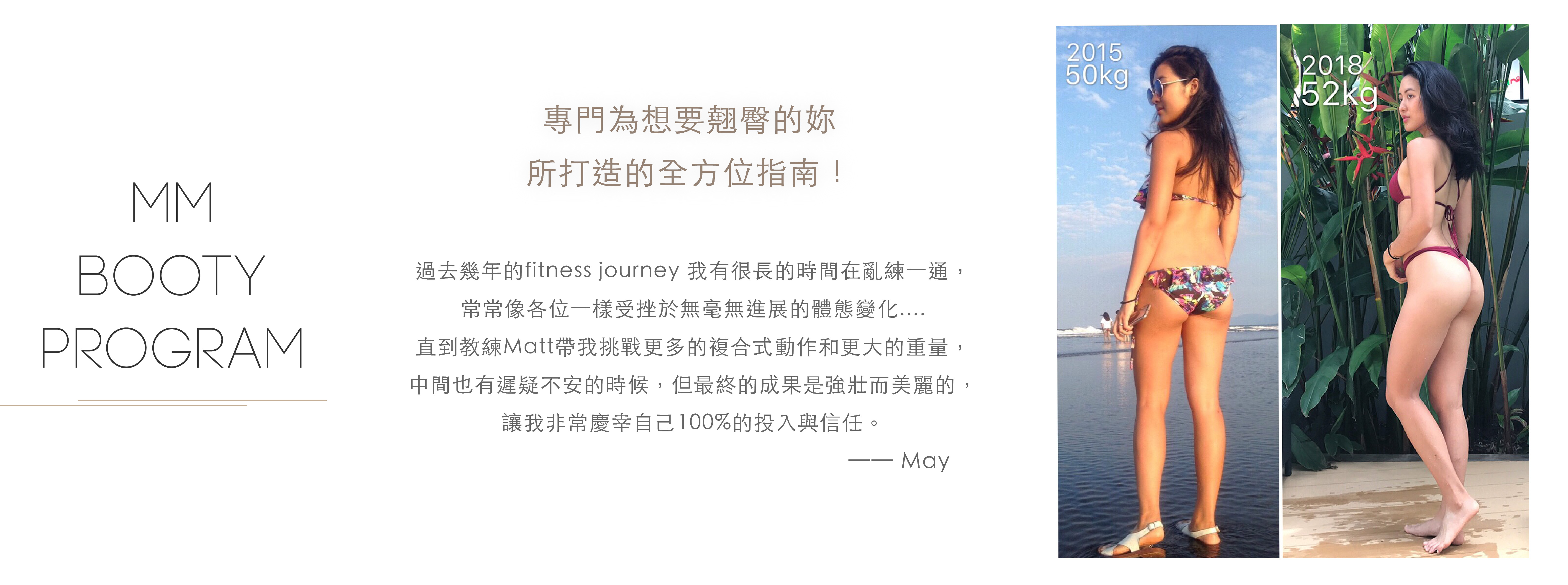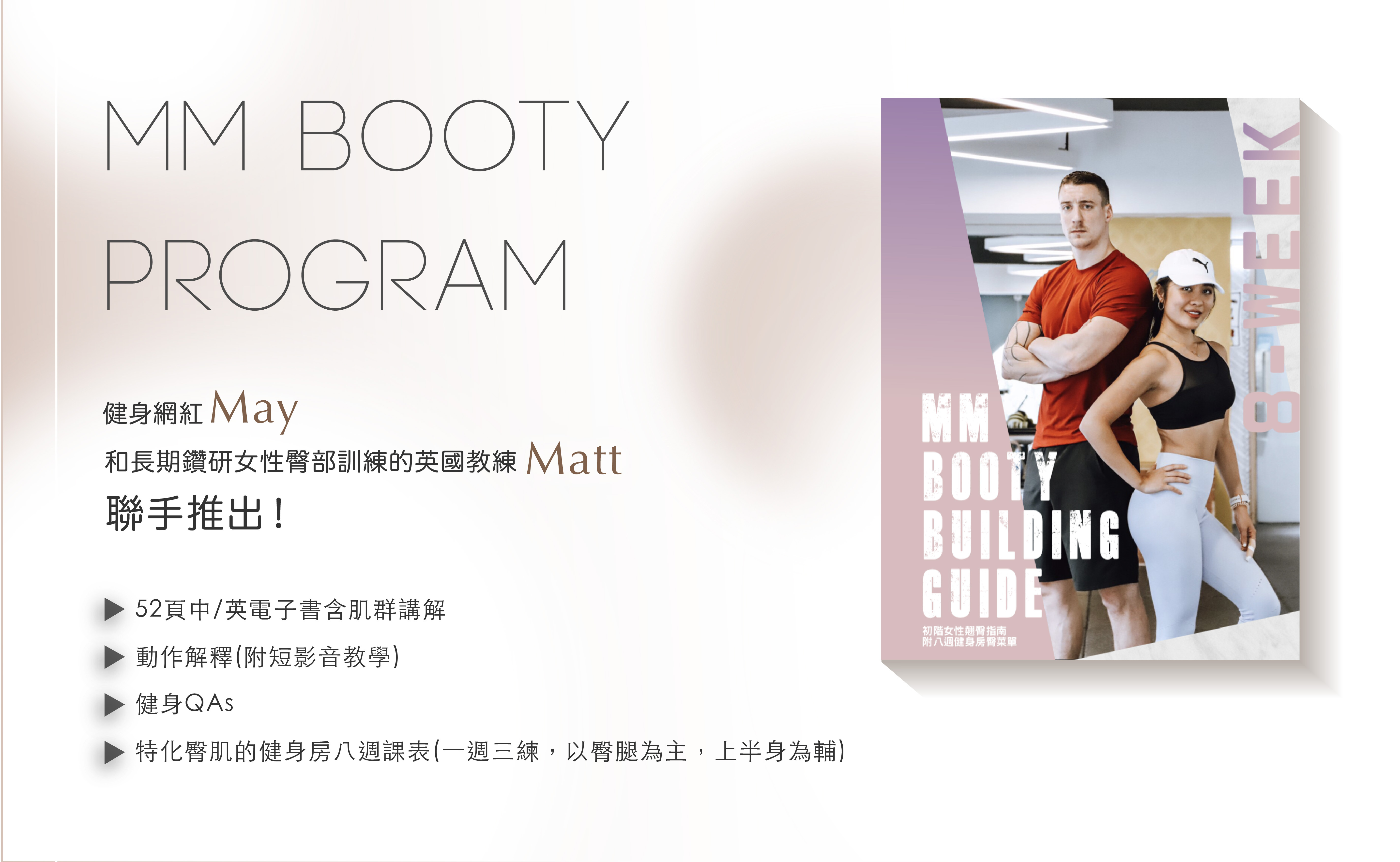 我和教練 Matt 聯手的MM Booty Program 女性翹臀指南終於正式上線! 為何稱為「指南」而非「菜單」呢?原因是這份50多頁的pdf電子檔不僅提供八週健身菜單,也講述了基本的解剖學觀念、增肌原理和各種健身QA!